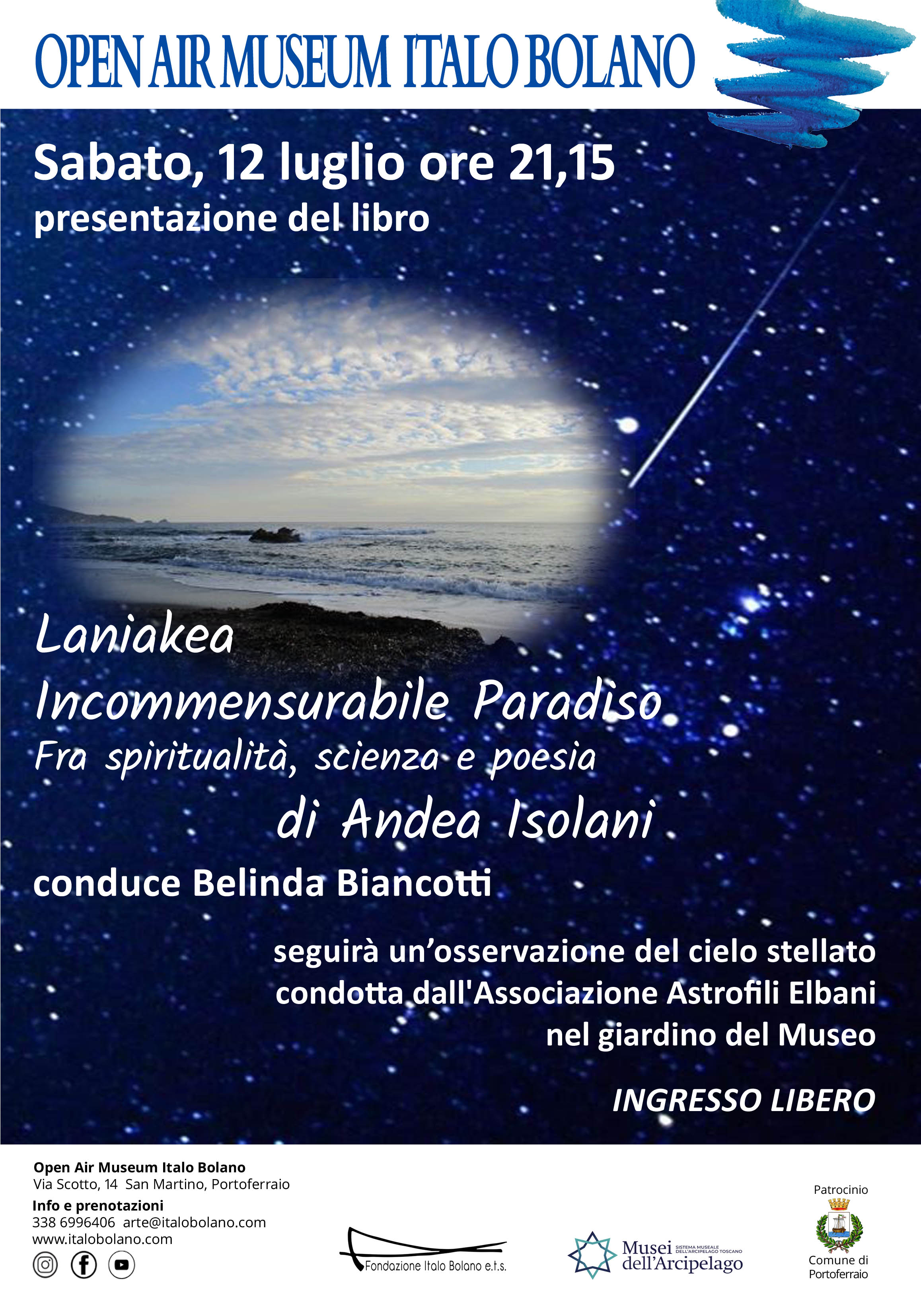 Seguirà un evento che la Fondazione Italo Bolano è felice di accogliere nella parte più buia del Museo, in quel prato che solo pochi giorni fa ha accolto più di centosessanta spettatori ad acclamare il Teatro delle Tisane: un’ osservazione astronomica tenuta e condotta dall’Associazione Astrofili Elbani” di cui Andrea è stato co-fondatore a fine anni ’90 e membro attivo fino al 2017. L’Associazione è tuttora molto attiva collaborando anche con il Parco Nazionale dell’Arcipelago Toscano nella divulgazione delle scienze astronomiche al pubblico e nelle scuole elbane di ogni ordine e grado”.