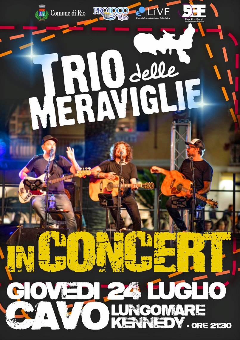 Giovedì 24 luglio, alle 21:45, sul Lungomare Kennedy a Cavo, si esibisce in concerto il gruppo “Trio delle Meraviglie”. Una serata fra musica e virtuosismi, in cui il repertorio della band accompagna il pubblico in un viaggio tra generi e suggestioni. Il Trio delle Meraviglie è una delle band più apprezzate proprio per il loro modo di “darsi” al pubblico, con un vastissimo repertorio di canzoni che in un attimo fanno ripercorrere alcuni momenti della propria vita. Il concerto è organizzato dalla Pro Loco di Rio in collaborazione con il comune e l’agenzia Live di Portoferraio.