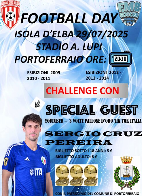 Una serata di sport, spettacolo e divertimento. Si terrà martedì 29 luglio dalle ore 20,30 presso lo stadio “A Lupi” di Portoferraio, la prima edizione del “Football Day”, un evento organizzato dalla società Audace Isola d’Elba in collaborazione con FM8 Soccer Academy. Per l’occasione scenderanno in campo i giovani calciatori delle annate 2009,2010,2011 ed in seguito quelle dal 2012 al 2014. Non è finita qui, a rendere più coinvolgente la serata ci penserà la special guest Sergio Cruz Pereira, noto influencer, conosciuto per le sue grandi abilità con il pallone da calcio e 3 volte pallone d’oro Tik Tok Italia. L’influencer animerà la festa, sfidando il pubblico ed i giovani giocatori con delle challenge e mosse tecniche spettacolari. I biglietti saranno disponibili ad un prezzo contenuto di 5 euro per gli under 18 ed 8 euro per gli adulti. La manifestazione sarà patrocinata dal Comune di Portoferraio, un occasione per trascorrere una divertente serata. << E’ una serata di festa che abbiamo voluto organizzare come evento conclusivo della stagione 24-25. Come sempre abbiamo voluto unire sport e promozione turistica, coinvolgendo un personaggio famosissimo sui social, pertanto sarà anche un evento che regalerà momenti di spettacolo anche per tutti i turisti dell’Isola che vorranno partecipare. L’evento è aperto a tutti. >> così ci ha dichiarato il presidente della società Audace Isola d’Elba Luca Baldi.