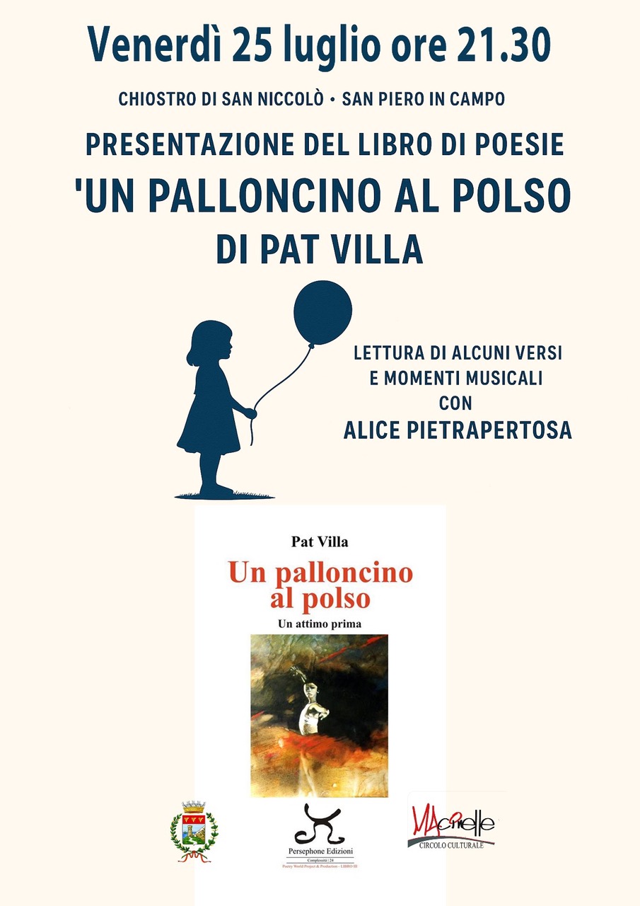 Una serata di poesia e musica quella di venerdì 25 luglio a San Niccolò alle 21.30 . Patrizia Villa ritorna a San Piero ( dopo la piacevole sorpresa di “ Punctum” lo scorso anno ) con il suo nuovo libro “ Un palloncino al polso”, Persephone Edizioni, per un incontro del Circolo Culturale Le Macinelle dedicato alla poesia. L’autrice livornese ci parlerà dei sui componimenti, spesso ispirati a figure femminili, donne comuni ma speciali, che rivivono attraverso la memoria come in un bozzetto tratteggiato con la penna dell’empatia e della comprensione.