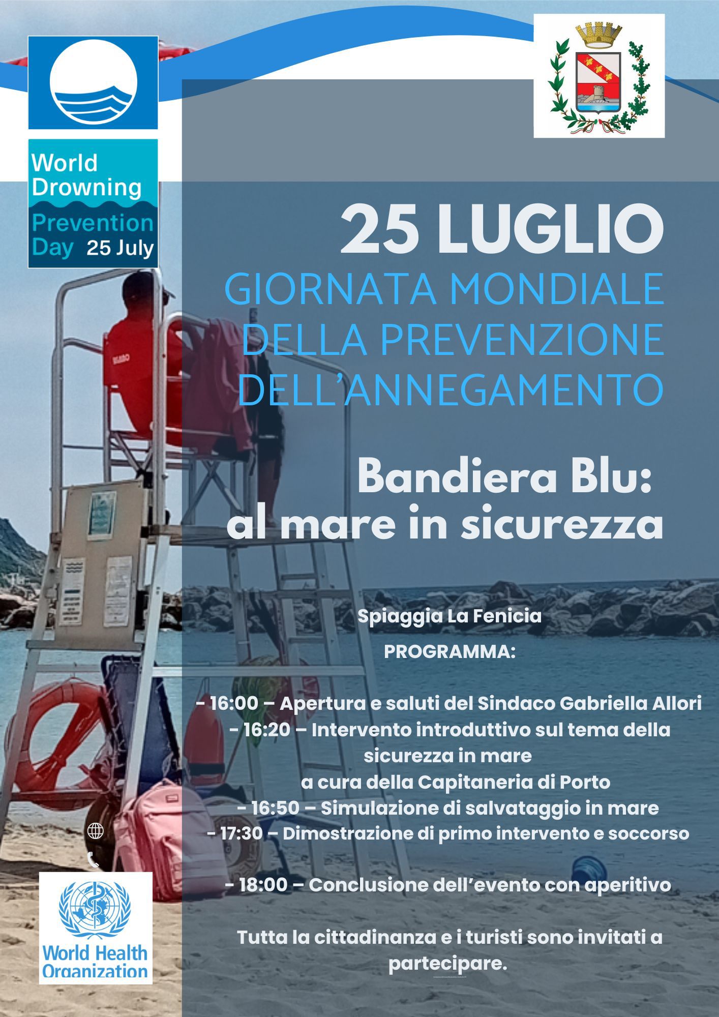 Oggi 25 luglio è la Giornata Mondiale della prevenzione dell’annegamento; si tratta di una iniziativa dell’ O.M.S. conseguente alla risoluzione dell’ONU dell’aprile 2021, che mira ad evidenziare il tragico e profondo impatto dell’annegamento e ad offrire strategie di prevenzione salvavita. Quest’anno in Italia tutte le località Bandiera Blu dedicano la giornata all’informazione sulla necessità di prevenire annegamenti, attraverso incontri con istituzioni ed operatori, che vedranno dimostrazioni sulla sicurezza in spiaggia e sul primo soccorso. Sensibilizzare sul tema del salvamento è un criterio del Programma Bandiera Blu e rappresenta un punto essenziale, affinchè la cittadinanza tutta acquisisca consapevolezza su un corretto e più sicuro rapporto con la risorsa Mare. Ecco perché oggi contemporaneamente tutti i 246 Comuni Bandiera Blu organizzeranno lo stesso evento, dando così più forza a questo messaggio. Il Comune di Marciana Marina organizzerà l’evento oggi pomeriggio dalle 16,00 alle 18,00 sulla spiaggia della Fenicia, una delle tre spiagge del comune che hanno ottenuto il riconoscimento.