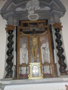 (Portoferraio. Duomo.Navata laterale sinistra guardando l’altare maggiore, in cornu Evangeli. Altare col titolo “altare del crocifisso”). Nella prima metà del seicento si aprono due cappelle,corrispondenti ai due altari laterali vicini all’altare maggiore,una nella parete di mezzogiorno per volere di un certo Prospero Castelletti di Milano ma domiciliato a Portoferraio intitolata a S Carlo e S. Lucia e l’altra nella parete di tramontana intitolata alla Vergine del Rosario e ai santi Crispino e Crispiniano in quanto patroni della corporazione dei calzolai a spese dei quali la cappella era stata eretta:nell’altare di questa cappella fu posta una tela raffigurante la Madonna del Rosario. E’ nella seconda metà del seicento che avvengono ampliamenti importanti, ampliamenti descritti nel 1791 da Sebastiano Lambardi “…Il governatore Tornaquinci pensò di accrescerla qualche poco,per il che fare ,ottenuto dalla pietà per Principe l’ordine fece l’accrescimento di due cappelle ,dove era prima il coro dell’altare maggiore ,facendo il coro più indietro e una nuova sagrestia da parte. Nelle nuove cappelle in una vi pose l’altare del Crocifisso e nell’altra quello di San Liborio. Nella parte diritta vi fece ancora i fondamenti per tirare ancora indietro la Cappella della madonna del Buon Viaggio , e con nuovi risarcimenti di stucchi ,restò allora la Chiesa terminata nell’arco principale ,sotto il quale risiede l’altare maggiore ,come oggidì si vede ” (Cfr pg 178-179 di “Memorie antiche moderne dell’isola dell’Elba” Sebastiano Lambardi 1791.Ristampa fotomeccanica, Forni editore. Bologna 1966) Nel particolare del dipinto “veduta di Portoferraio”sono visibili gli ampliamenti sopra descritti dal Lambardi.
