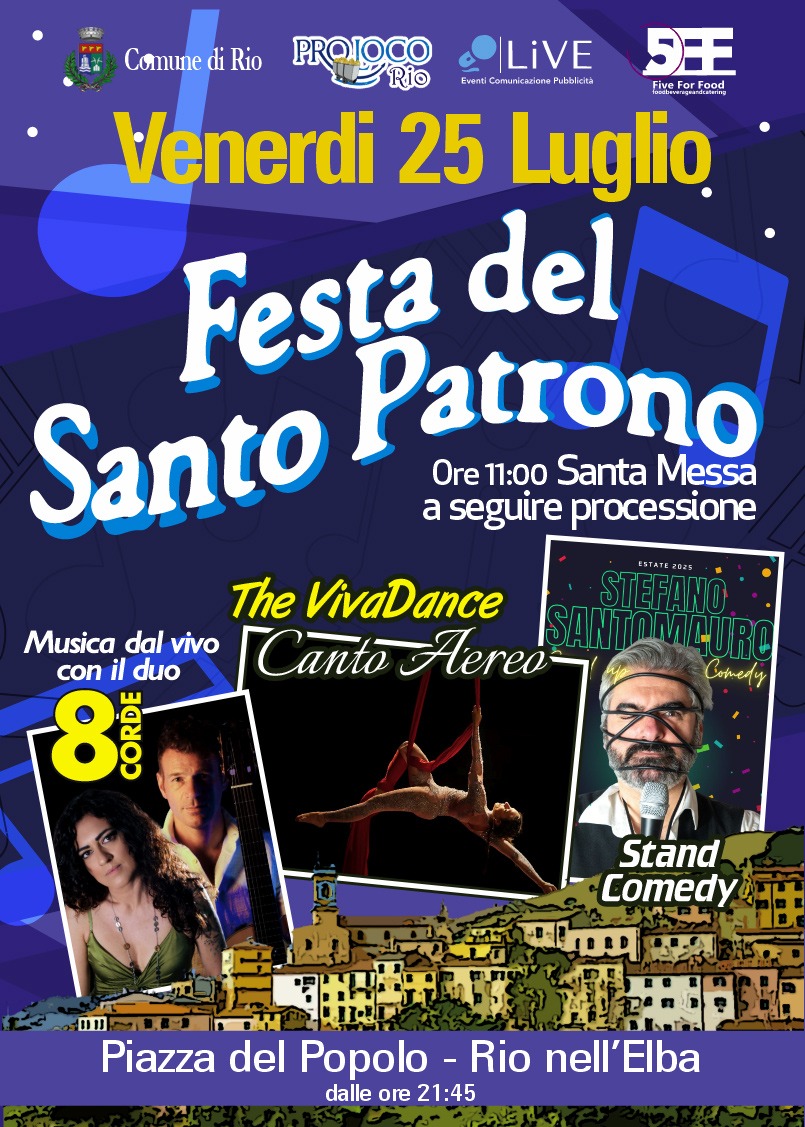 IL 25 luglio è la festa del Santo Patrono di Rio nell’Elba. L’amministrazione comunale in collaborazione con la Pro Loco ha previsto una sere di appuntamenti in occasione della ricorrenza. San Giacomo è il patrono del borgo e l’appuntamento con le celebrazioni religiose, e poi la festa serale, è molto sentito e amato non solo dai residenti ma anche dai turisti. Alle 11.00 si terrà la Santa Messa che sarà seguita dalla tradizionale processione e poi la sera a partire dalle 21.30 in Piazza del Popolo si terrà “Acrobati, musica e cabaret” spettacolo musicale di intrattenimento e lo show del canto aereo.