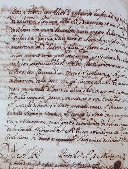 Giuseppe Maria Goretti umilissimo servo e suddito di V.A.R. reverentemente espone e narra come ritrovandosi l’Oratore in Portoferraio nella prossima passata stagione dell’ estate commise in una chiesa di detto luogo un furto di robba sacra per il quale è stato condannato alla pena di morte con il reservo di un mese a supplicar esendo il qual termine genuflesso alla somma pietà dell’A.V.R. quella con ogni umiltà supplicando a volerli commutar detta pena in altra che non apporti infamia ai suoi congiunti ,ritrovandosi due sorelle fanciulle ,un fratello prete Curato di anime et altro fratello applicato a professione decorosa et honorata.Che di tal gratia sarà sempre e far pregare S. D.M. per ogni maggiore esaltazione della sua Real Casa .Quam Deus “