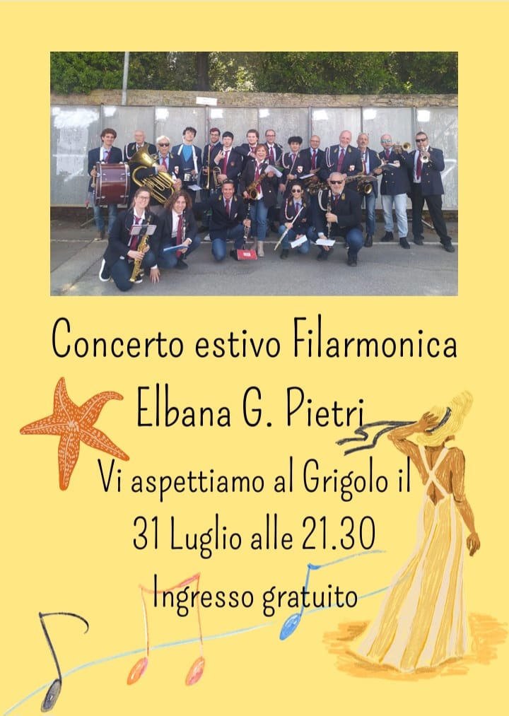 Questa sera, 31 luglio, ci sarà il secondo concerto estivo della Filarmonica Elbana Giuseppe Pietri ore 21.30 al Grigolo. La Filarmonica partirà dalla piazza marciando fino ad arrivare alla location molto suggestiva del Grigolo, dove si esibirà.