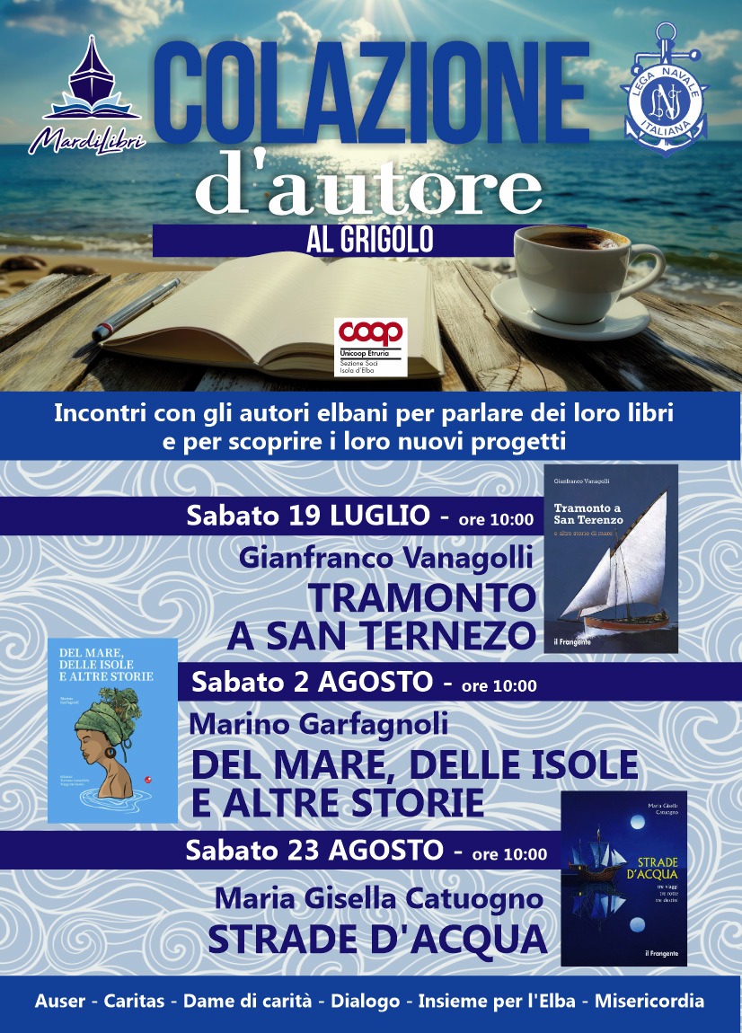 Continuano al Grigolo gli appuntamenti con “Colazione d’Autore”. Il due agosto alle ore 10 Marino parla del suo libro “del Mare, delle storie e altre isole”. sabato 23 agosto alla stessa ora ci sarà Maria Gisella Catuogno con il suo “Strade d’acqua”.