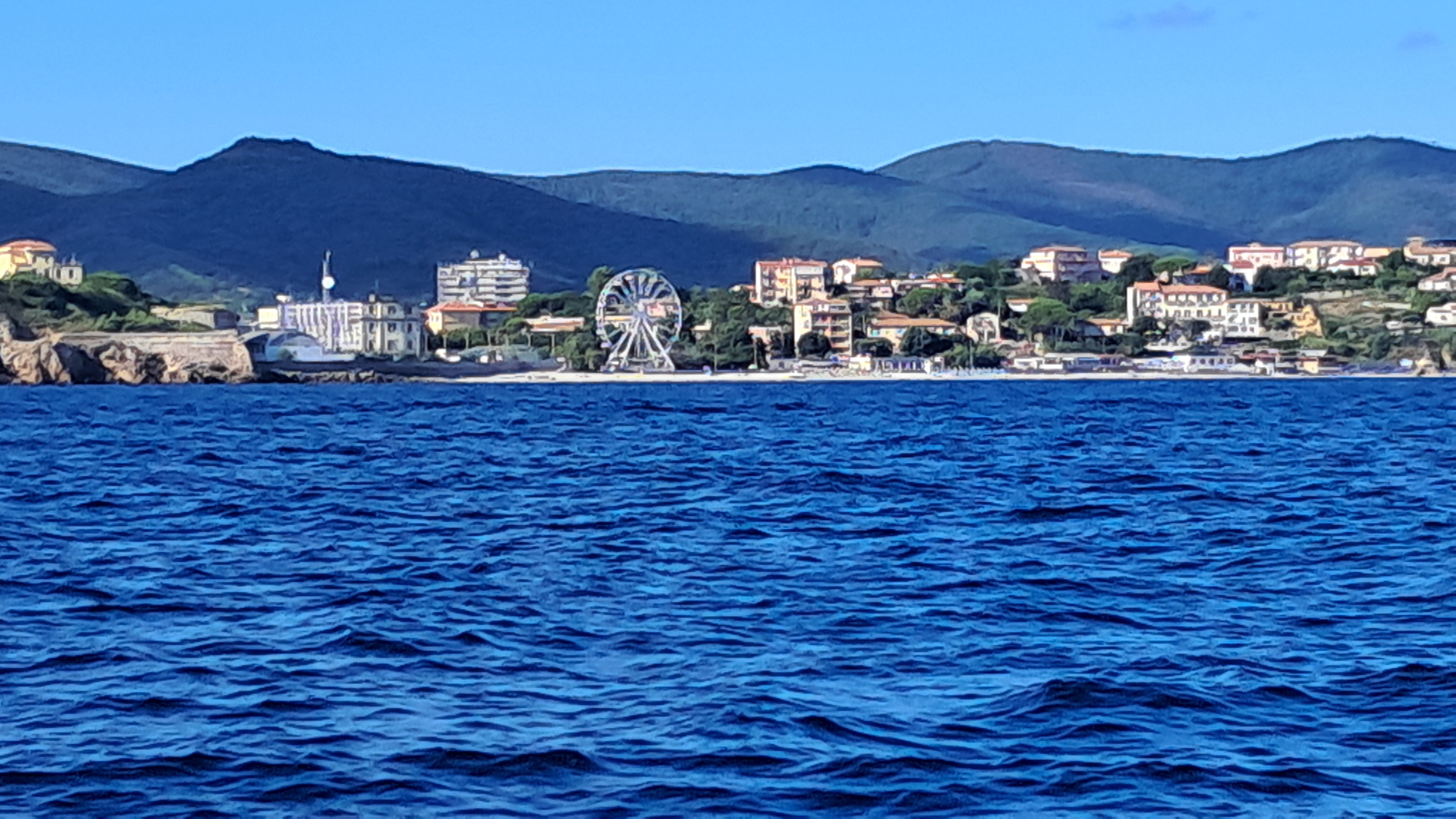 Ormai a dire il vero la notizia non c’è più: la ruota panoramica delle Ghiaie è diventata parte integrante dell’estate elbana, e la foto ne è la conferma anche dal punto di vista paesaggistico-ambientale. Vista dl mare, infatti, non si capisce dove fosse tutto questo scandalo, visto che nel panorama è comunque anche sovrastata dal profilo del grattacielo del porto, quello sì scandalo architettonico degli anni ’60 ormai digerito dall’opinione pubblica. La ruota alle Ghiaie funziona, e semmai dispiacerà l’anno prossimo vederla spostata in un’altra location. Ma chissà, magari ce ne saranno due…