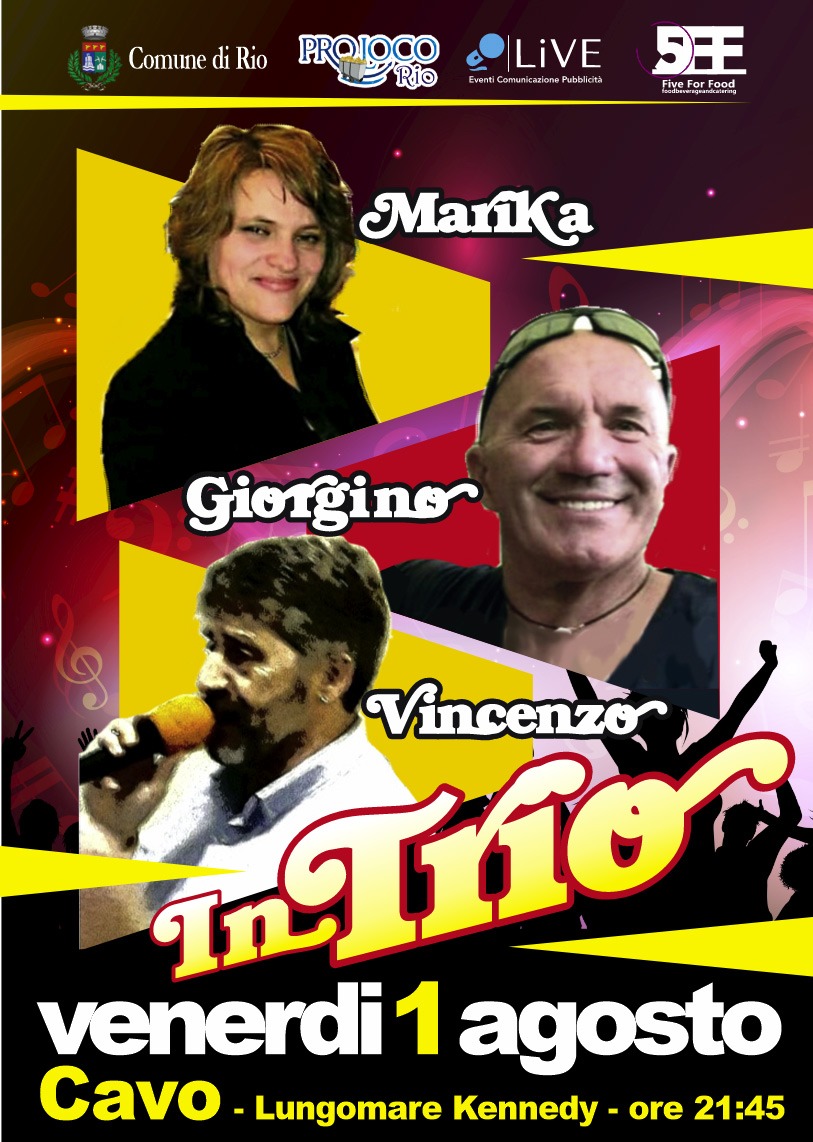 Venerdì 1° agosto, il Lungomare Kennedy di Cavo ospiterà alle 21:45 un appuntamento musicale all’insegna della leggerezza e dell’energia positiva. Sul palco si esibiranno Marika, Giorgino e Vincenzo con uno spettacolo intitolato Musica Solare, che promette di accompagnare il pubblico tra note allegre e melodie estive. L’ingresso è gratuito, la manifestazione è organizzata dal comune di Rio e dalla Paolo Loco.