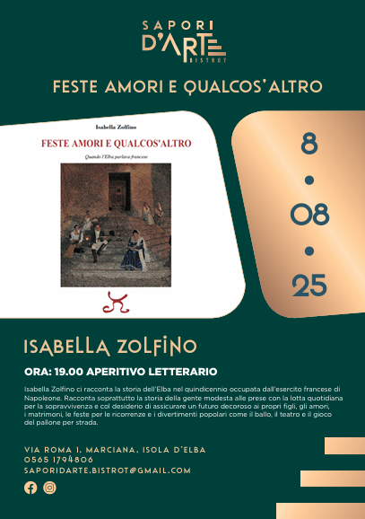 Venerdì 8 agosto, al ristorante Bistrot Sapori d’Arte alle ore 19,00 , Isabella Zolfino presenterà il suo libro “Feste amori e qualcos’altro”. Un aperitivo letterario, dove l’autrice avrà l’occasione di raccontare la storia dell’Isola d’Elba occupata dall’esercito francese di Napoleone Bonaparte. Il libro racconta soprattutto la storia della gente modesta alle prese con la lotta quotidiana per la sopravvivenza e con il desiderio di assicurare un futuro decoroso ai propri figli, gli amori, i matrimoni, le feste per le ricorrenze ed i divertimenti popolari come il ballo, il teatro ed il gioco del pallone per strada.