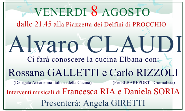 Sarà Alvaro Claudi la Guest Star di domani sera, venerdì 8 agosto in Piazzetta dei Delfini a Procchio, a partire dalle 21.45! Piu’ che una conferenza del famoso chef uno spettacolo con al centro la cucina Elbana in tutte le sue sfumature, condotto da Angela Giretti per l’Associazione Culturale Procchio Napoleonica; insieme a Claudi vi sarà Rossana Galletti in rappresentanza dell’Accademia Italiana della Cucina (istituzione della Repubblica Italiana) e Carlo Rizzoli, giornalista in rappresentanza del giornale online Elbareport. Vi saranno, inoltre, degli interventi musicali e in prosa di Francesca Ria e Daniela Soria che allieteranno il pubblico attraverso dei folcloristici intermezzi; al termine della serata sarà messo a disposizione verso il pubblico intervenuto un dolce tipico dell’Elba e dell’aleatico DOCG offerto dall’Azienda Villa Mori di Portoferraio. Le riprese video, per la diretta Facebook, saranno garantite dalla Edicola Elbana.