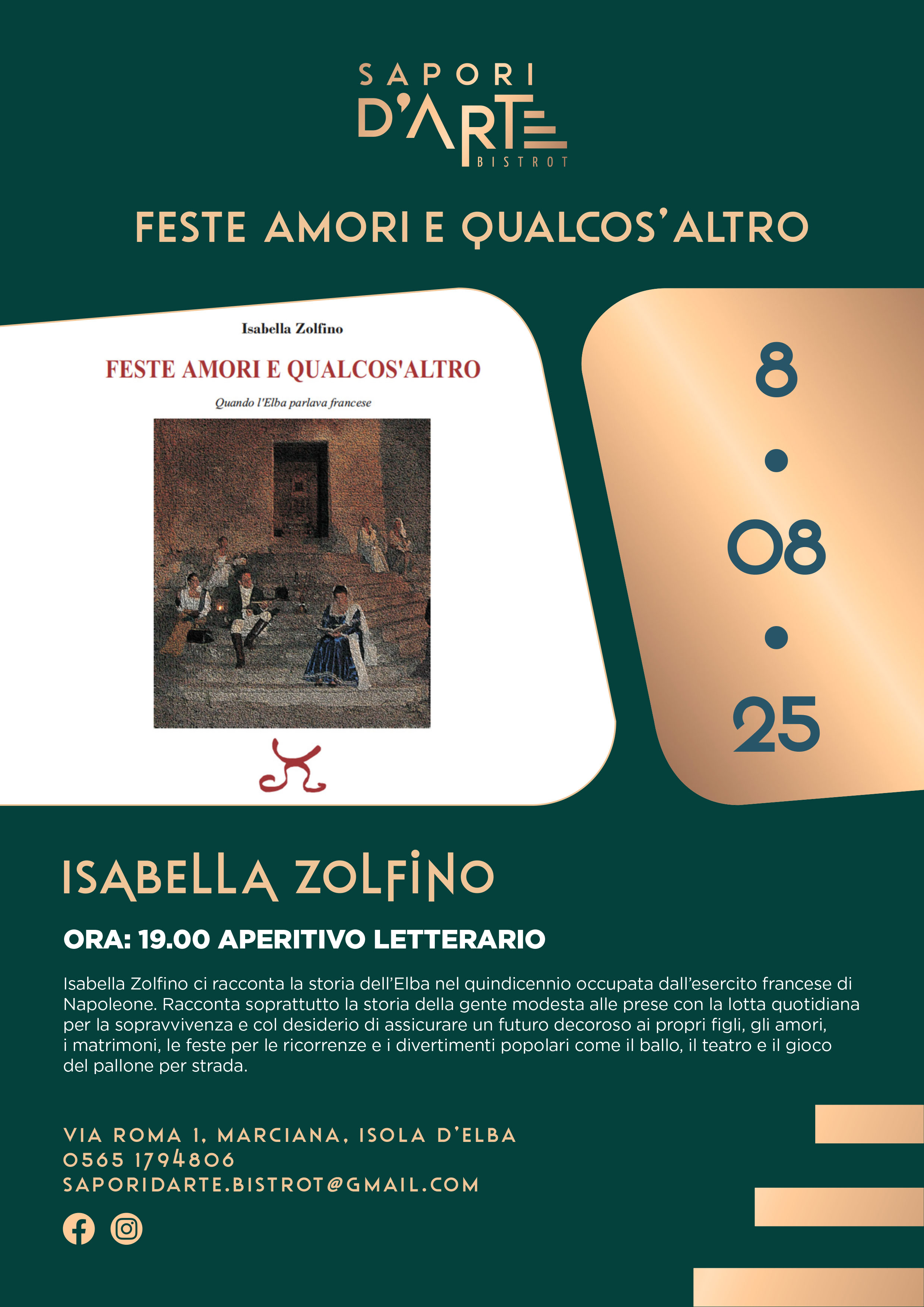 Venerdì, 8 agosto alle ore 19,00 presso “Sapori d’arte bistrot” a Marciana, Via Roma, 1, avremo un ‘Aperitivo letterario’ con la presentazione del libro:”Feste amori e qualcos’altro. Quando l’Elba parlava francese” di Isabella Zolfino. L’Autrice ci svela altri particolari di quei quindici anni di dominio francese sull’isola d’Elba. Questa opera è il suo quarto lavoro dedicato a quel periodo, affrontato mettendo in risalto, di volta in volta aspetti precisi legati alla Sanità Pubblica, all’Istruzione o a fatti poco noti come la deportazione di uomini di colore provenienti dalla colonia francese di Santo Domingo. Libri pubblicati da questa Casa editrice e accuratamente documentati da Isabella Zolfino, grazie al certosino lavoro di ricerca negli Archivi storici nazionali e internazionali. Qui sotto alcuni pensieri in relazione al nuovo libro da parte dell’Autrice: “In questo lavoro ho voluto raccontare la storia di un paese occupato da un esercito straniero, la storia di quell’Elba che, fin dal primo giorno dell’arrivo dei cosiddetti paladini della libertà e dei diritti civili, ha accettato di subire cambiamenti nelle sue abitudini, nelle sue usanze, nelle convenzioni e persino nella lingua. Ed è, appunto, per mettere in luce i cambiamenti avvenuti nella vita quotidiana degli elbani durante quel periodo, forse il più sconvolgente e denso di trasformazioni per l’Europa ma, soprattutto, per l’Elba, che è nato questo lavoro: far conoscere il mutamento delle abitudini, le nuove esigenze, i nuovi bisogni e il disagio di chi si era reso conto che il senso morale non era più quello che obbediva ai vecchi principi ormai radicati nella cosiddetta gente perbene ma un altro. Isola d’Elba, periodo francese 1802-1815. Ho voluto riportare la vita della gente modesta alle prese con la lotta quotidiana per la sopravvivenza e col desiderio di assicurare un futuro decoroso ai propri figli, raccontare i bisticci con la vicina di casa, le storie delle donne di strada e quelle di ladri e malfattori, ma, anche, gli amori, i matrimoni e le feste per celebrare le ricorrenze più importanti e, fra proibizioni e permessi, anche i divertimenti popolari come il ballo, il teatro o il gioco del pallone per strada. Ogni occasione era buona per dimenticare miseria e privazioni. Nonostante tutto, gli uomini e le loro storie restano le stesse in ogni luogo e in ogni tempo e le miserie, le emozioni e i timori provati in quel quindicennio francese continuano ad essere provati anche oggi, quasi allo stesso modo. Anche questo lavoro è frutto del mio sentimento d’amore per l’Elba e per la sua storia, un’Isola che mi ha accolto con amore e della quale mi sforzo di far conoscere, per quanto mi è possibile, almeno una piccola parte del suo immenso Patrimonio culturale”.
