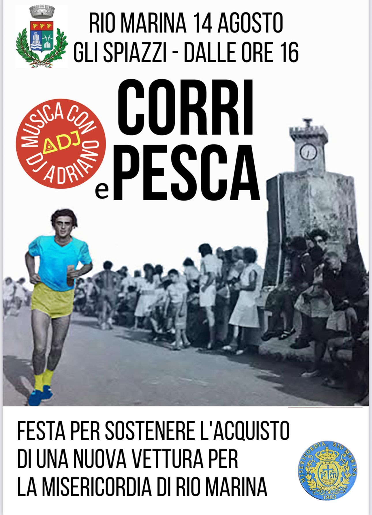 Giovedì 14 agosto si terrà a Rio Marina (Gli Spiazzi) dalle ore 16,00 in poi “Corri e Pesca”, una festa per sostenere l’acquisto di una nuova vettura per la Misericordia di Rio Marina. Dalle ore 16,00 saranno aperte le iscrizioni (al costo di 10 euro) per la gara. Alle ore 18,00 inizierà una corsa dei bambini, mentre, alle 18,30 partirà la corsa “sciambere” su un percorso di 6,5 km. Inoltre al solo costo di 2 euro hai la possibilità di pescare uno dei 500 articoli divertentissimi a tua disposizione. Il premio è sicuro!. La manifestazione sarà accompagnata da musica live del Dj Adriano. Per informazioni: Luciano 3271239973.