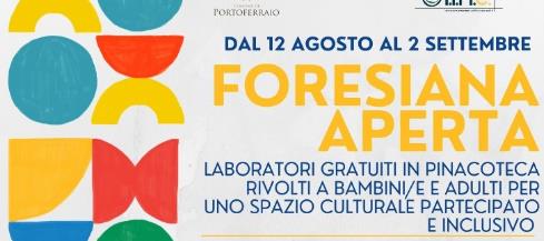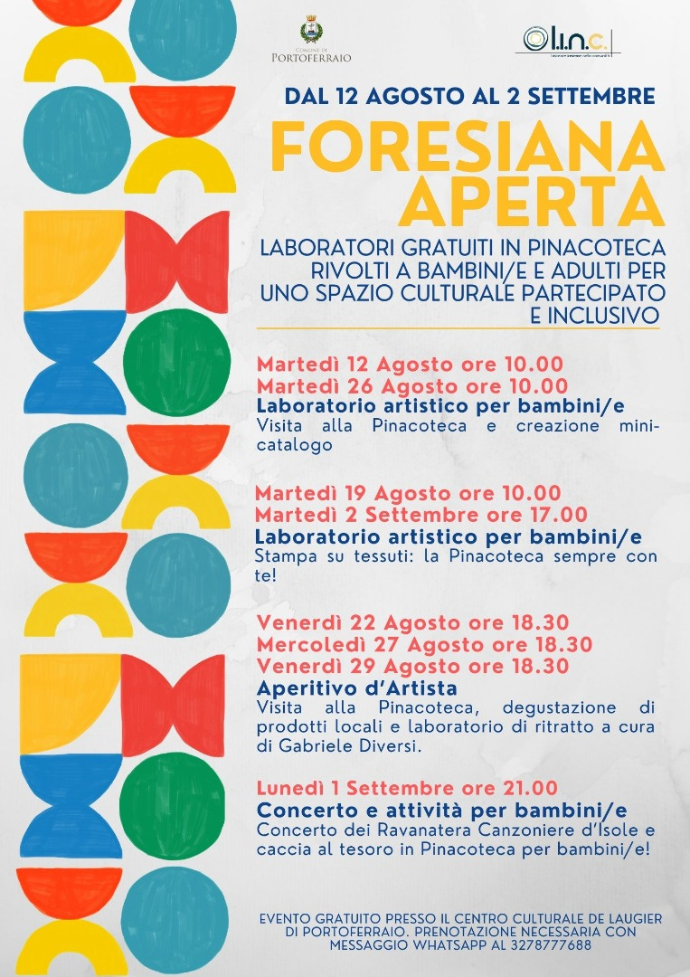 Il progetto Foresiana Aperta nasce su iniziativa del Comune di Portoferraio in collaborazione con la Cooperativa Sociale LINC per rafforzare il ruolo della Pinacoteca Foresiana come luogo vivo, accessibile e capace di generare relazioni significative attraverso l’arte. L’obiettivo è contribuire all’apertura del museo alla comunità, rendendolo uno spazio partecipato, inclusivo e creativamente attivo. Il programma accompagnerà tutto il mese di Agosto con un calendario ricco di iniziative gratuite rivolte a famiglie, bambini/e e cittadini/e. Di seguito il calendario completo: