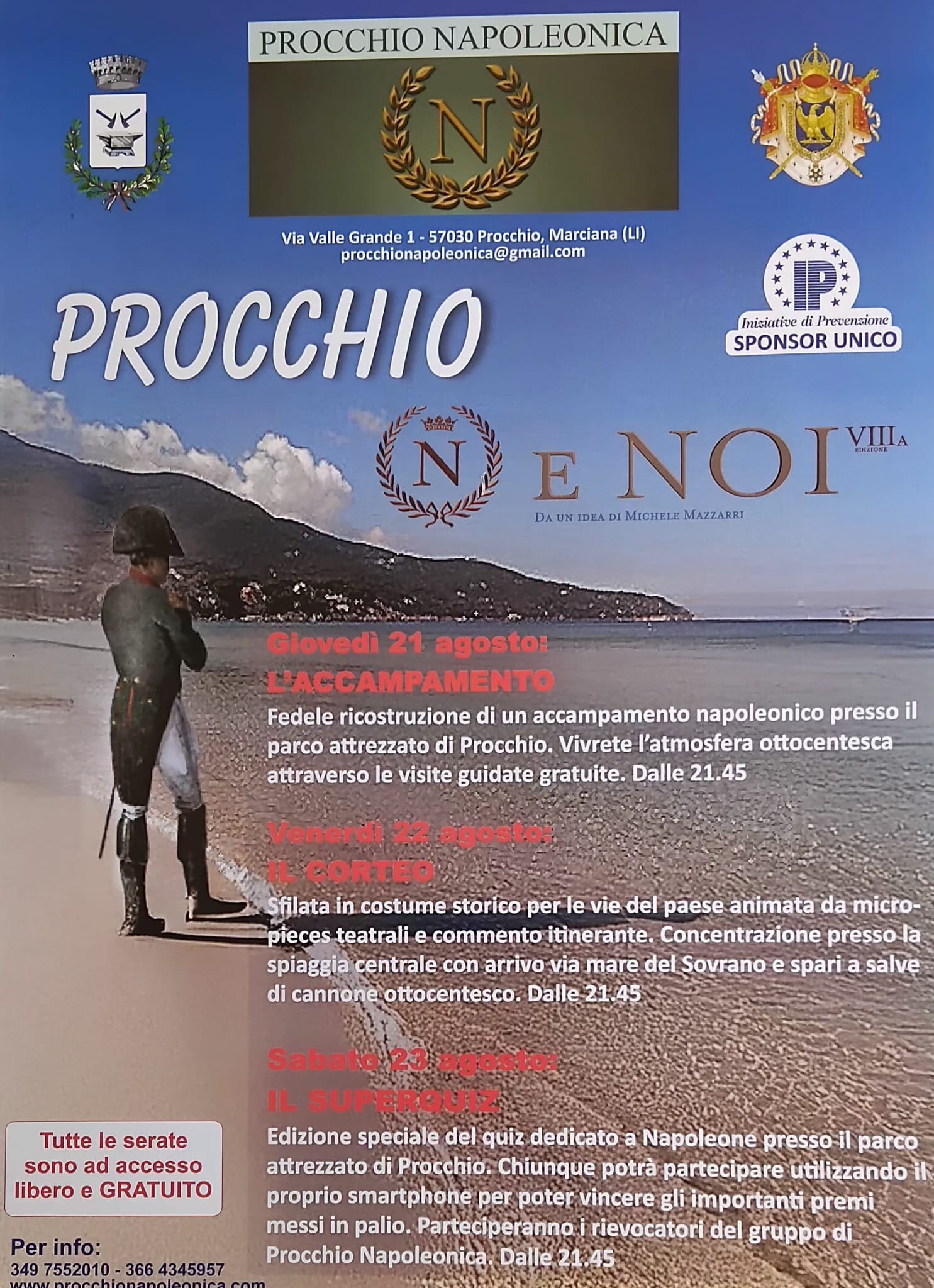 Un tris di eventi per l’associazione Procchio Napoleonica, da giovedì 21 fino a sabato 23 agosto. Giovedì 21 si terrà una fedele ricostruzione di un accampamento storico di Napoleone presso il Parco Attrezzato di Procchio, una serata ambientata nell’ottocento attraverso le visite gratuite dalle ore 21,45. Nella serata di venerdì si terrà una sfilata in costume storico nelle vie del paese di Procchio, animate da micropieces teatrali e commento itinerante. Concentrazione presso la spiaggia centrale con arrivo via mare del sovrano e spari a salve di cannone ottocentesco dalle ore 21:45. Infine sabato sera dalle ore 21:45 ci sarà un edizione speciale di un quiz napoleonico presso il parco attrezzato di Procchio. Potrà partecipare chiunque usando il proprio smartphone con la possibilità di vincere degli importanti premi messi in palio.