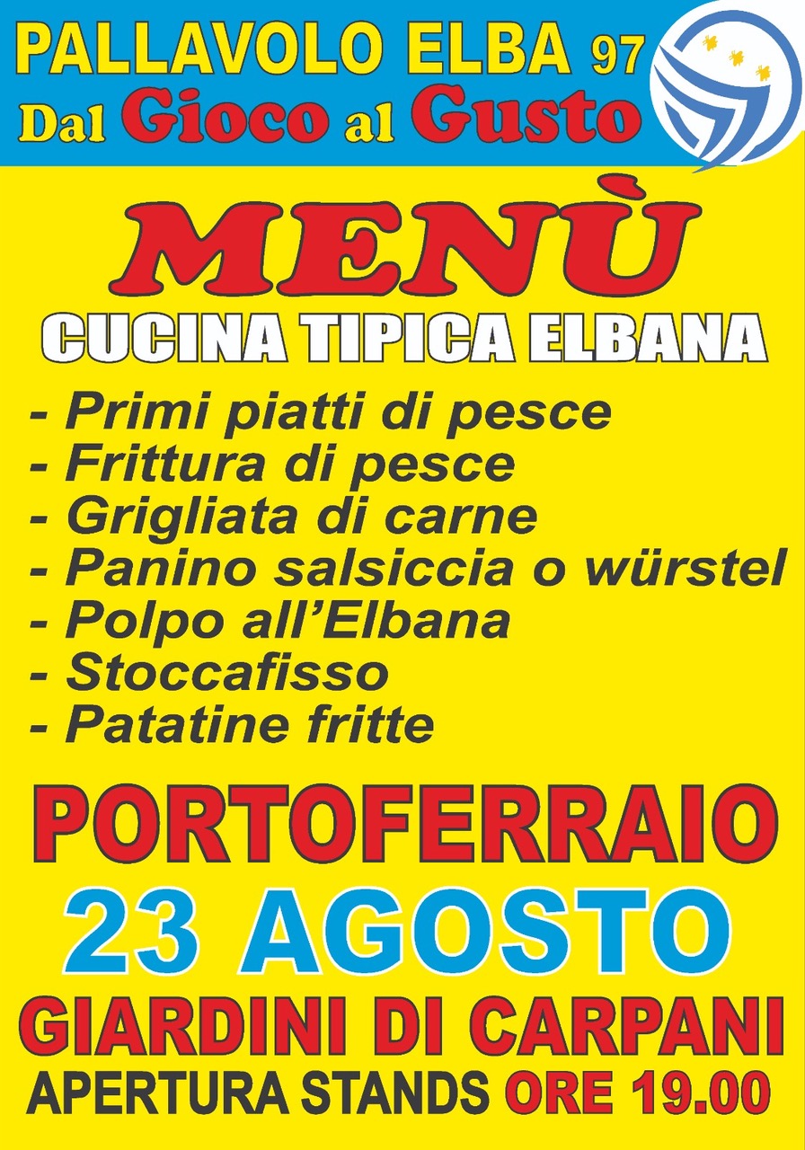 Dal gioco al gusto. La pallavolo Elba organizza la sagra della pallavolo Elba che si terrà sabato 23 agosto presso i giardini di Carpani. L’apertura agli stands è prevista alle ore 19,00, la festa sarà accompagnata da un menù tipico elbano.