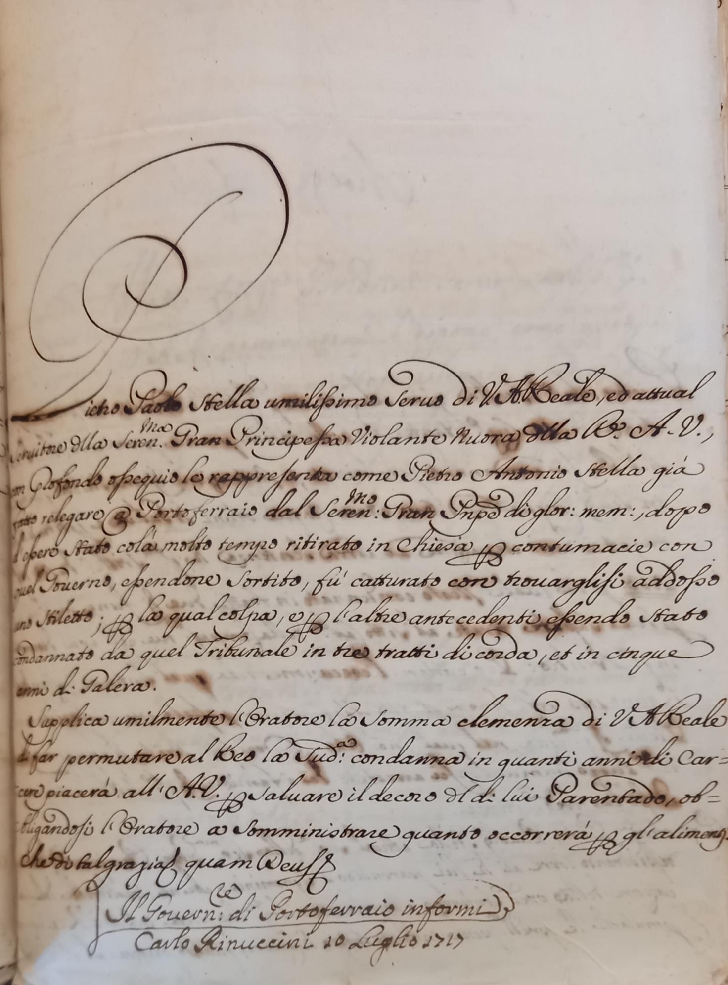 Nel 1717 è governatore pro tempore della città di Portoferraio Girolamo Niccolini . Questa la informativa della vicenda manoscritta inviata dal governatore integralmente trascritta: “ Altezza Reale Pietro Antonio Stella già Relegato in questa Città d’ordine di V,A.R. ,per sentenza de 20 luglio stante colle debite previe partecipazioni della A.V.R. fu condannato per delazione e retenzione di uno stiletto al pagamento di scudi 50 ( ) cinque anni di galera e perdita dell’articolazione et a darvi esecuzione ad altra sentenza di questo tribunale de 25 agosto 1713 per la quale restò condannato in tratti due di fune in pubblico per due sassate tirate al Sotto Caporale della Compagnia dove egli era iscritto in questo Presidio. Per evitare l’esecuzione della qual sentenza è stato dall’anno 1713 Agosto fino agli otto Agosto prossimo passato 1717 rifugiato nella Pieve di questa Città ,nel qual anno essendosi fatto lecito di ispezionare in detto luogo immune, fu arrestato dai famigli di questo Tribunale e trovata dopo la predetta Arme. Presentemente Pietro Paolo Stella attualmente Servitore delle Serenissima Gran Principessa Violante ,desiderando torre al di lui parentado l’ignominia che ne risulterebbe dalla esecuzione della predetta sentenza ,supplica umilmente la pietà dell’A.V.R. a permutarli le predette pene in tanto tempo di carcere quanto parrerà all’A.R.V.