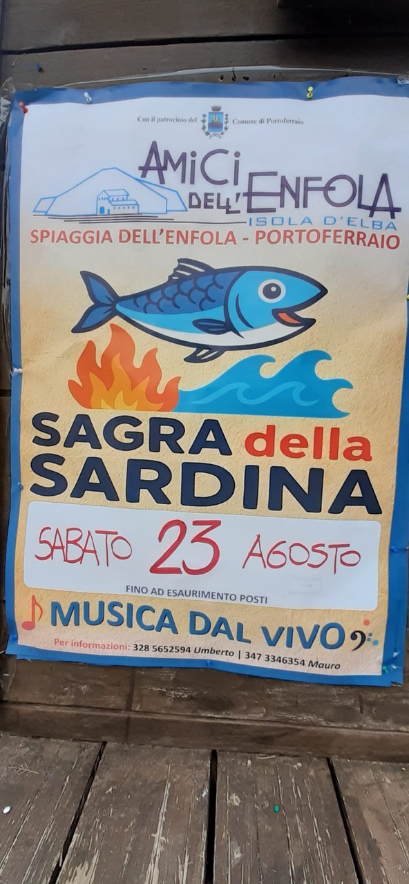 Una serata di divertimento organizzata dagli Amici dell’Enfola, sull’omonima spiaggia, sabato 23 agosto. Si rinnova la Sagra della Sardina, con la simpatia di Giorgino ad animare musicalmente. Iniziative molto apprezzate da turisti e residenti. L’ingresso è a partire dalle ore 20 e fino a esaurimento posti. Per informazioni: 3285652594 (Umberto) – 3473346354 (Mauro)