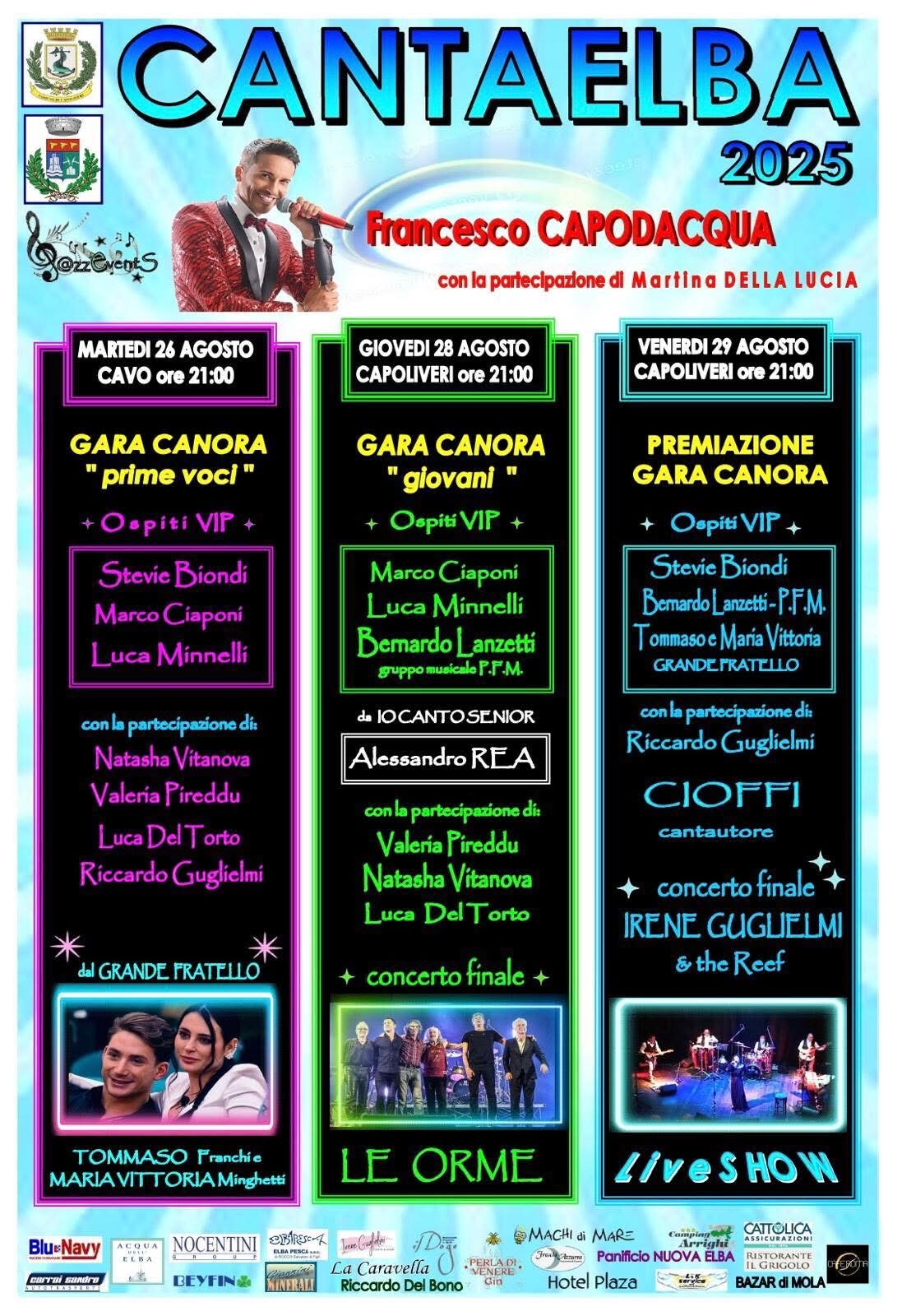 Torna il CantaElba con l’edizione 2025. Saranno tre le serate di questo fine agosto, e un’esibizione all’interno dell’istituto penitenziario di Porto Azzurro a Capoliveri. La prima tappa si terrà martedi 26 agosto a Cavo sul lungomare Kennedy con inizio alle ore 21.00. Si tratta di una gara canora “prime voci”. Una serata all’insegna della musica con tra gli ospiti, Steve Biondi, Marco Ciaponi, Luca Minelli e la partecipazione di Natasha Vitanova, Valeria Pireddu, Luca del Torto e Riccardo Guglielmi. Direttamente dal Grande Fratello presenzieranno l’evento, Tommaso Franchi e Maria Vittoria Minghetti . A presentare la manifestazione sarà Francesco Capodacqua. Il CantaElba a Cavo è organizzata dalla Pro Loco, in collaborazione con l’amministrazione comunale, la Fondazione PazzEvents e l’agenzia Live srl.