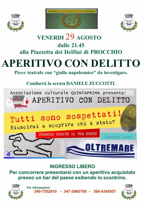 Venerdì 29 agosto alla Piazzetta dei Delfini di Procchio, si terrà “Aperitivo con delitto”, una piece teatrale con “giallo napoleonico” da investigare. La serata sarà condotta da Daniele Zuccotti. L’ingresso per l’evento sarà libero, per partecipare basta presentarsi con un aperitivo acquistato presso un bar del paese esibendo lo scontrino. Per info: 349-7552010 – 347- 2960700 – 366-4345957