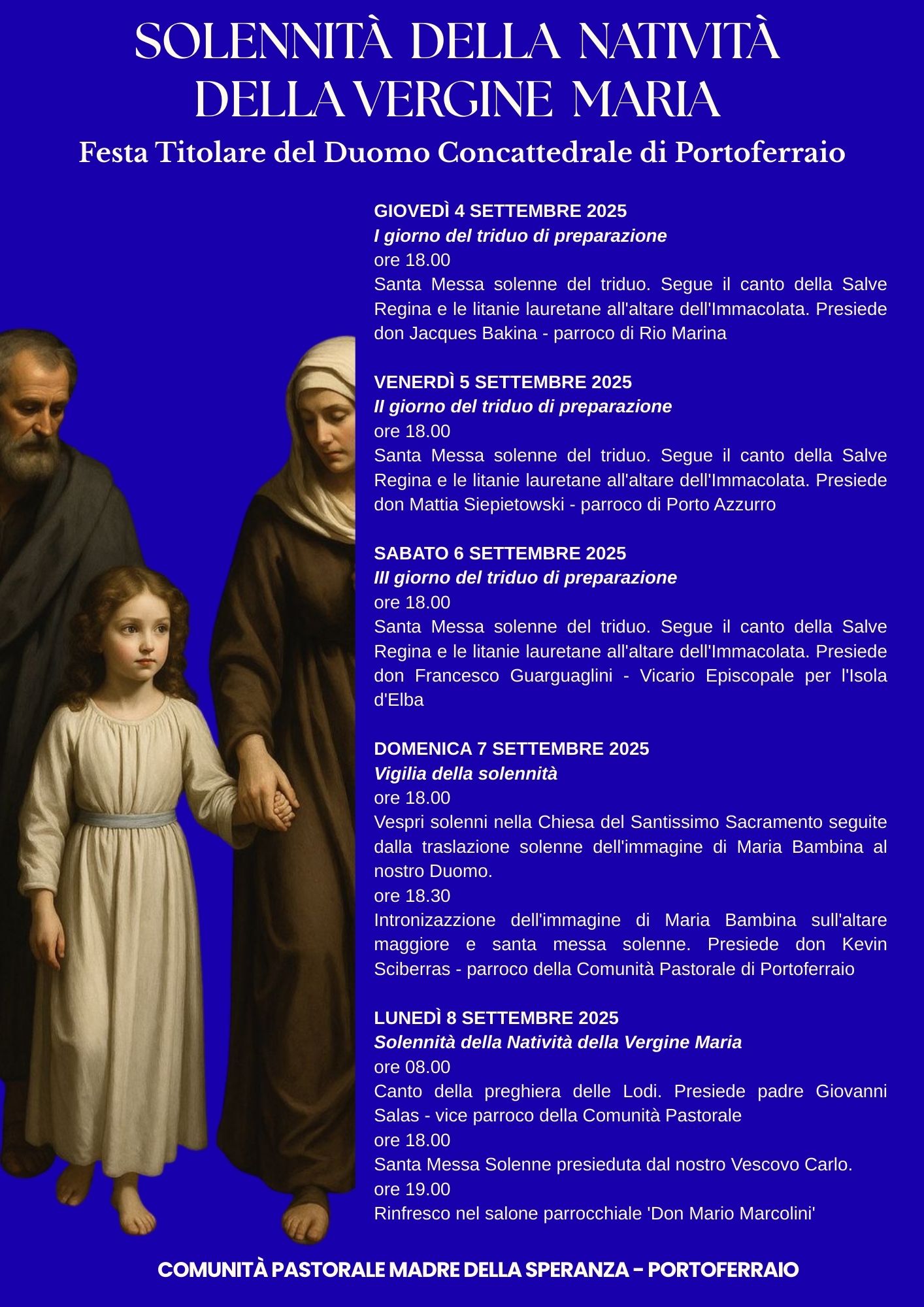 “Questa settimana è speciale per la nostra comunità pastorale,- annuncia il parroco – essendo la settimana preparatoria alla festa del nostro Duomo, cioè quella dedicata a Maria Bambina che sarà celebrata lunedì 8 settembre e i dettagli del rito della festa saranno comunicati prossimamente. Da giovedì 4 a sabato 6 celebriamo il triduo solenne. Tutti i giorni alle 18, al Duomo, verrà celebrata la Santa Messa del triduo in onore della Vergine Maria, seguita da una breve celebrazione davanti alla statua di Maria Bambina. Domenica 7 settembre, vigilia della festa, la celebrazione comincerà alle 17.30, col canto dei vespri della Madonna nella Chiesa del Santissimo Sacramento, da dove partirà una breve processione fino al Duomo per la traslazione dell’immagine di Maria Bambina. Seguirà l’intronizzazione dell’immagine e la Santa Messa alle 18”. E si passa a mercoledì 3 settembre, quando il coro di Santo Stefano insieme a Tuttincoro, presentano un concerto corale nella chiesa di Santo Stefano alle Trane, alle 19. Tutti sono invitati a partecipare e a godersi questa serata musicale e allo stesso tempo sarà possibile sostenere la più piccola comunità della nostra Comunità pastorale Madre della Speranza di Portoferraio. Seguirà un aperitivo per tutti, in oratorio.