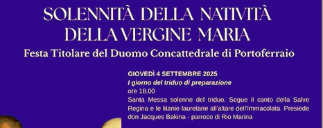 “Questa settimana è speciale per la nostra comunità pastorale,- annuncia il parroco – essendo la settimana preparatoria alla festa del nostro Duomo, cioè quella dedicata a Maria Bambina che sarà celebrata lunedì 8 settembre e i dettagli del rito della festa saranno comunicati prossimamente. Da giovedì 4 a sabato 6 celebriamo il triduo solenne. Tutti i giorni alle 18, al Duomo, verrà celebrata la Santa Messa del triduo in onore della Vergine Maria, seguita da una breve celebrazione davanti alla statua di Maria Bambina. Domenica 7 settembre, vigilia della festa, la celebrazione comincerà alle 17.30, col canto dei vespri della Madonna nella Chiesa del Santissimo Sacramento, da dove partirà una breve processione fino al Duomo per la traslazione dell’immagine di Maria Bambina. Seguirà l’intronizzazione dell’immagine e la Santa Messa alle 18”. E si passa a mercoledì 3 settembre, quando il coro di Santo Stefano insieme a Tuttincoro, presentano un concerto corale nella chiesa di Santo Stefano alle Trane, alle 19. Tutti sono invitati a partecipare e a godersi questa serata musicale e allo stesso tempo sarà possibile sostenere la più piccola comunità della nostra Comunità pastorale Madre della Speranza di Portoferraio. Seguirà un aperitivo per tutti, in oratorio.