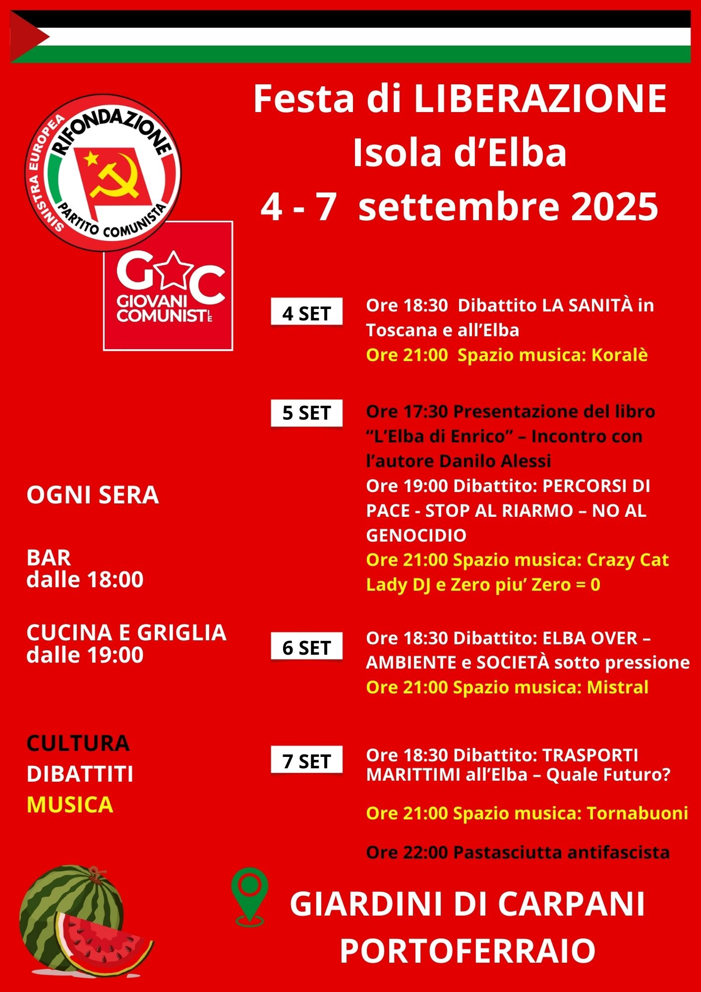 Nutrito è il programma dei dibattiti, aperti agli interventi di tutte le persone interessate. Giovedì si parlerà di Sanità e venerdì di Pace – Riarmo – Palestina con la presenza di Alfio Nicotra, che più volte ha tentato con la sua associazione di portare aiuti umanitari alla popolazione palestinese attraverso il valico di Rafah. Per sabato il tema in discussione sarà: Elba Over – Ambiente e Società sotto pressione con Franco Cambi (Professore Ordinario Università di Siena), Marco Rinaldi (Consorzio Alberi Maestri), Andrea Cirica (Filcams -CGIL), Costanza Lupi (Giovani Comunisti), Flavio Marzolla (PRC Elba). Per finire domenica si parlerà del caldissimo tema dei trasporti marittimi con la presenza del Sindaco di Portoferraio che si confronterà con rappresentanti dei pendolari, sindacalisti e politici.