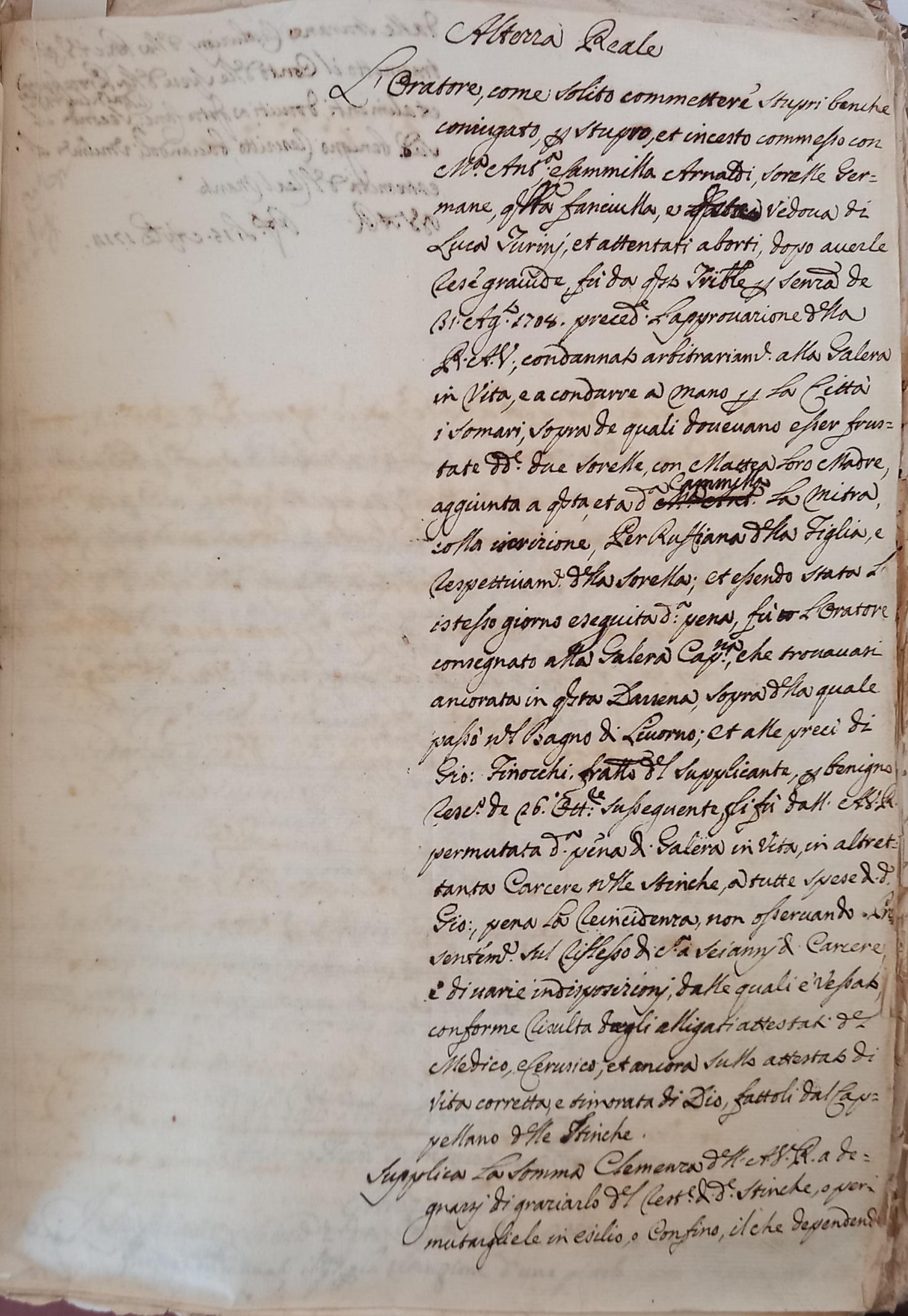 L’Oratore ,come solito commettere stupri benché coniugato,per stupro et incesto commesso contro Madonna Antonia e Camilla Arnaldi,sorelle Germane,quella fanciulla e quella vedova di Luca Turini,et attentati aborti,dopo anche rese gravide,fu da questo Tribunale per sentenza de 31 agosto 1708 proceduta l’approvazione della Reale Altezza Vostra ,condannato arbitrariamente alla galera in vita e a condurre a mano per la città i somari sopra de quali dovevano esser frustate dette due sorelle con mettere loro Madre aggiunta a queste et a detta Camilla la Mitra colla iscrizione ,’Per Ruffiana della Figlia’,e rispettivamente alla sorella ,et essendo stata l’istesso giorno eseguita detta pena fu l’Oratore consegnato alla Galera Capitana che trovavasi ancorata in questa Darsena sopra della quale passa Bagno di Livorno; et alle preci di Gio. Finocchi fratello del Supplicante per Benigno Rescritto de 26 ottobre susseguente gli fu dall’Altezza Vostra Reale permutata detta pena di Galera in vita in altrettanta carcere alle Stinche a tutte spese di detto Gio.pena la reincidenza ,non osservando. Presentemente sul riflesso() di sei anni di carcere e di varie in descrizioni dalle quali è restato conforme risulta dagli allegati attestati dal Medico Cerusico et ancora sullo attestato di vita corretta e timorata di Dio,fattoli dal Cappellano delle Stinche. Supplica la somma Clemenza dell’Altezza Reale Vostra degnarsi di graziarlo del restante delle dette Stinche o permutargliele in esilio o confino depende dalle sovrane resoluzioni della Reale Altezza Vostra .Qui trasmetto il conto delle spese della ( ) et alimenti dovuti a questa Cancelleria secondo il suddetto Benigno Rescritto baciandoli umilmente l’estremità della Real Mano