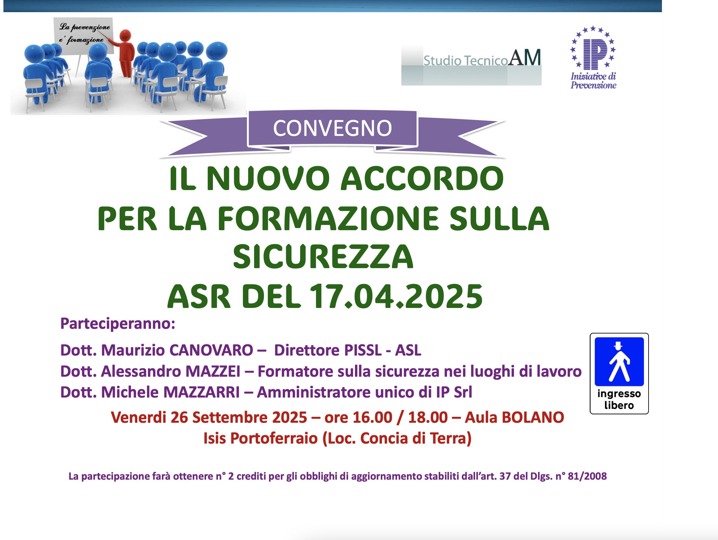 Iniziative di Prevenzione SRL e Studio AM, organizzano per VENERDI 26 SETTEMBRE, presso l’ISIS di Portoferraio (Aula Bolano) in Loc. Concia di Terra, in orario dalle 16.00 alle 18.00, un importante convegno scaturito dalle novità degli ASR del 17 aprile 2025, circa la formazione e l’addestramento obbligatorio nei luoghi di lavoro. Al convegno parteciperà il dott. Maurizio Canovaro in qualità di Direttore PISSL della ASL competente per territorio, il dott. Michele MAZZARRI in qualità di Amministratore Unico di IP Srl e il dott. Alessandro MAZZEI in ragione della qualifica di formatore abilitato. Sono previsti crediti formativi validi per l’aggiornamento obbligatorio dei lavoratori (art. 37 del Dlgs. n° 81/2008). I relatori si soffermeranno sulle molte novità intervenute, come il nuovo corso obbligatorio per tutti i datori di lavoro (pubblici e privati), la rimodulazione dei diversi percorsi formativi, le stringenti nuove procedure per poter erogare le didattiche e molto altro ancora; sarà quindi un momento di condivisione su un argomento che vedrà già dai prossimi mesi la messa in prova delle innovazioni sopraggiunte. Per partecipare sarà necessario prenotarsi chiamando lo 0565-907509 e, a tutti i partecipanti, sarà consegnata una dispensa di sintesi della nuova impostazione sulla formazione; l’ingresso è gratuito – disponibili 50 posti.