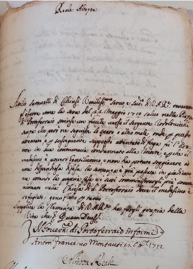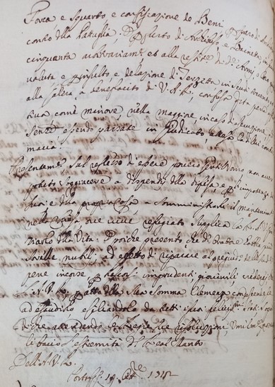 Presentemente sul reflesso di essere povero gentiluomo non aver potuto soggiacere ai dispendi della difesa e per l’impotenza dei suoi e della propria casa a somministrargli il mantenimento nella Chiesa ove vive refugiato , Supplica la Reale Altezza Vostra di graziarlo delle vita ,poiché presente che detto Oratore abbia più sorelle nubili ad effetto di riparare al pregiudizio delle suddette pene incorse per ( ) crederei che l’Altezza Vostra Reale per atto della Sua Somma Clemenza concedesse ad esaudirlo esiliandolo da tutti i suoi felicissimi stati ( ) attendo le Regie Sue resoluzioni ,umilmente bacio l’estremità della Real Mano