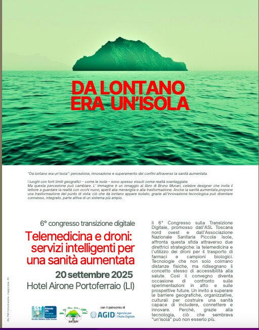 Promosso dall’Azienda USL Toscana nord ovest e dell’Associazione Nazionale Sanitaria Piccole Isole, con il patrocinio della Agid (Agenda per l’Italia digitale) si terrà sabato prossimo, 20 settembre 2025, a Portoferraio, all’hotel Airone, il sesto Congresso sulla Transizione Digitale, dal titolo “Da lontano era un’isola”, ispirato all’opera di Bruno Munari.