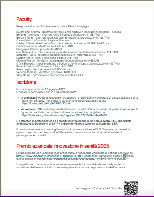 Il congresso sarà trasmessi anche in diretta sul canale You Tube dell’Azienda USL Toscana nord ovest.