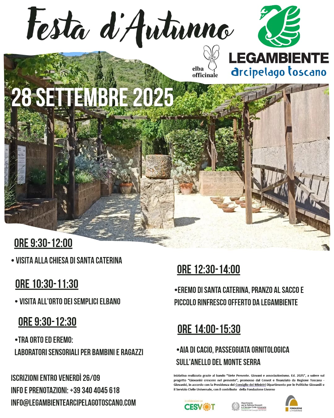 Per partecipare alla Festa è necessario prenotarsi al numero 3404045618 oppure scrivendo a info@legambientearcipelagotoscano.com entro venerdì 26/09.