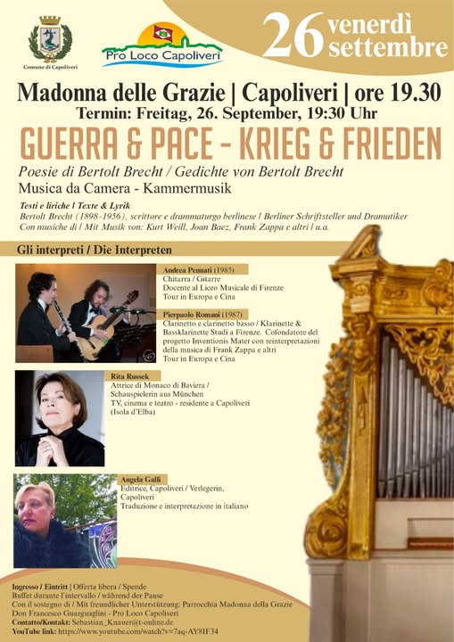 Venerdì 26 Settembre, presso il Santuario della Madonna delle Grazie a Capoliveri alle ore 19:30 Musica da Camera e Letture Teatrali tratte da Opere di Bertolt Brecht in tedesco e italiano con il duo musicale Inventionis Mater di Firenze.