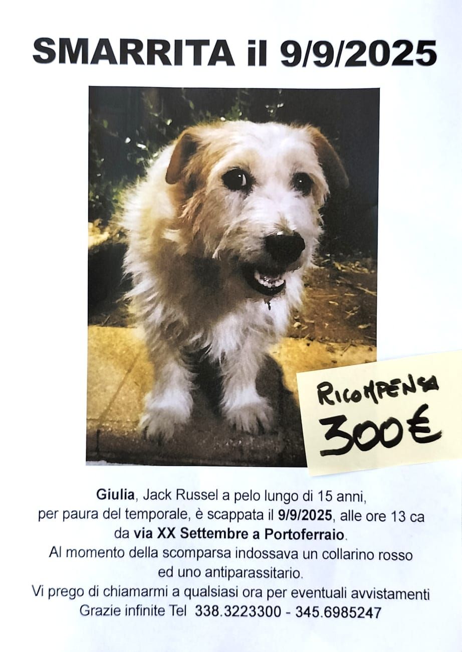 Continuano senza sosta le ricerche di Giulia, una bellissima jack russell a pelo lungo di 15 anni scappata da casa per la paura dei forti temporali che lo scorso 9 settembre hanno causato un nuovo nubifragio a Portoferraio. La cagnolina ha saltato il muro di cinta della sua casa di via XX Settembre, presumibilmente intorno alle 12:30. Da allora, la sua famiglia umana non si dà pace e la sta cercando disperatamente in lungo e in largo, tappezzando la città di volantini con la sua fotografia e i dettagli utili a riconoscerla. Prevista addirittura una ricompensa di 300 € per chi la ritrova.