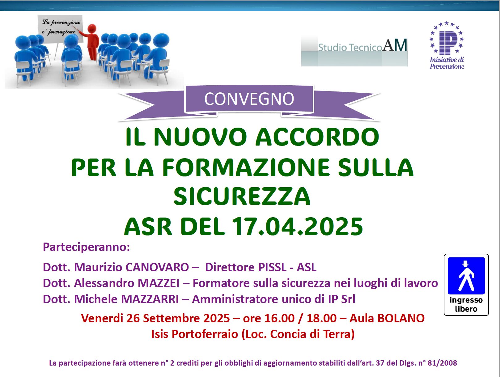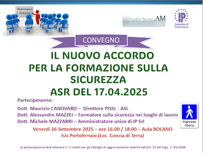 Si terrà venerdì 26 settembre dalle ore 16.00 alle 18.00, presso l’ISIS di Portoferraio (ex IPS, Loc. Concia di Terra) l’importante convegno sulle molteplici novità intervenute da maggio scorso circa molti percorsi obbligatori sulla sicurezza nei luoghi di lavoro, organizzato da Studio AM e IP Srl con la partecipazione della ASL, servizio PISLL.