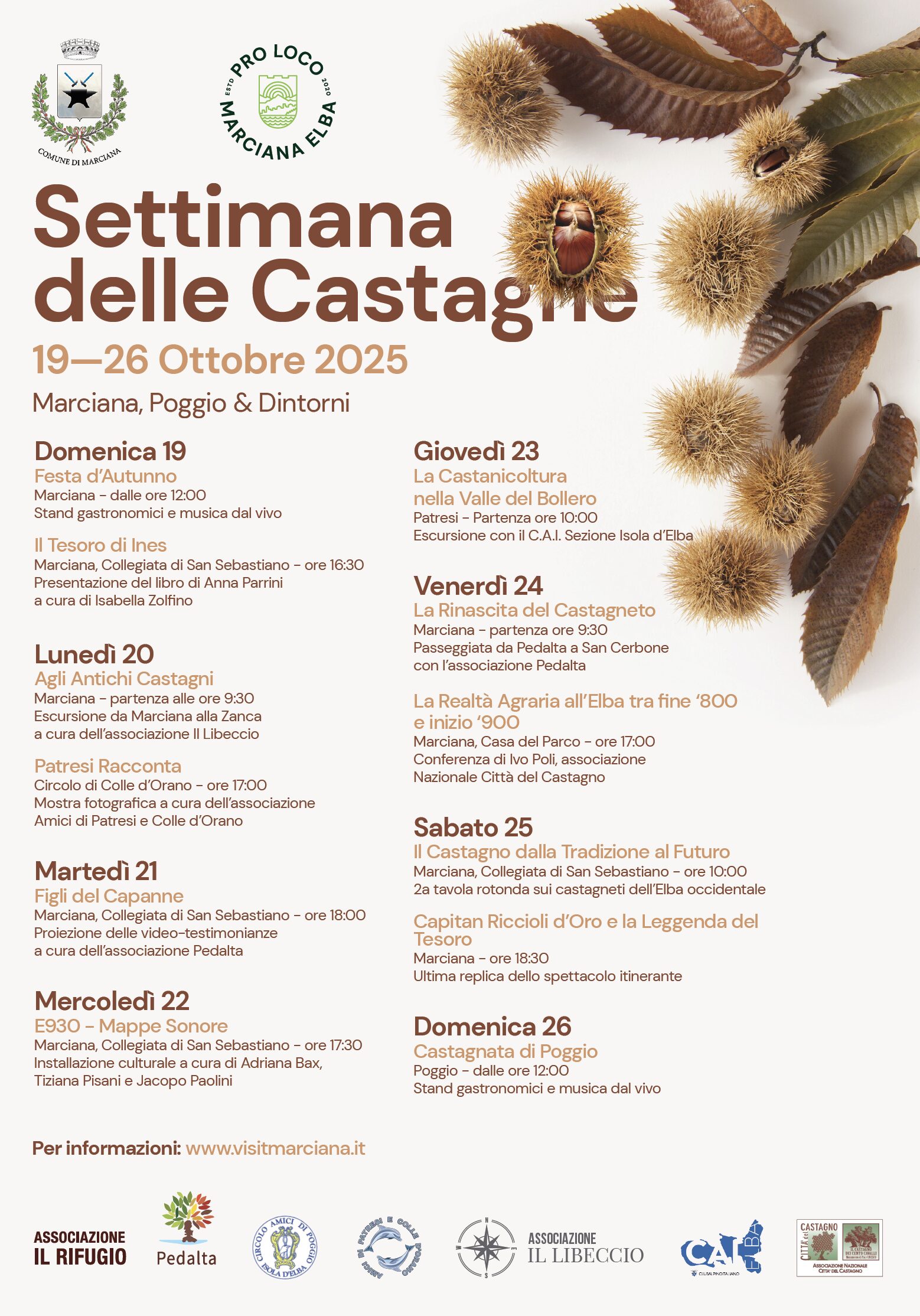 Inoltre, dopo quattro anni, viene riproposta la seconda tavola rotonda sui castagneti dell’Elba occidentale, “Il castagno dalla tradizione al futuro”, che si terrà a Marciana sabato 25 ottobre. La Settimana delle Castagne 2025 è realizzata dalla Pro Loco Marciana Elba per il Comune di Marciana con la collaborazione delle associazioni Pedalta, Il Rifugio, Circolo Amici di Poggio, Il Libeccio e Amici di Patresi e Colle d’Orano, C.A.I. Isola d’Elba e l’associazione Nazionale Città del Castagno.