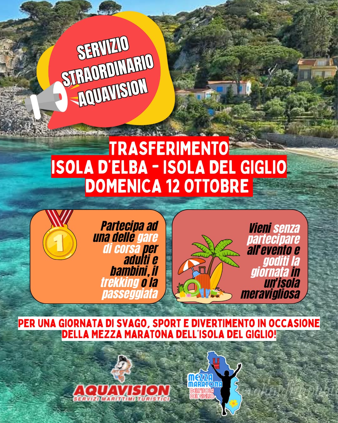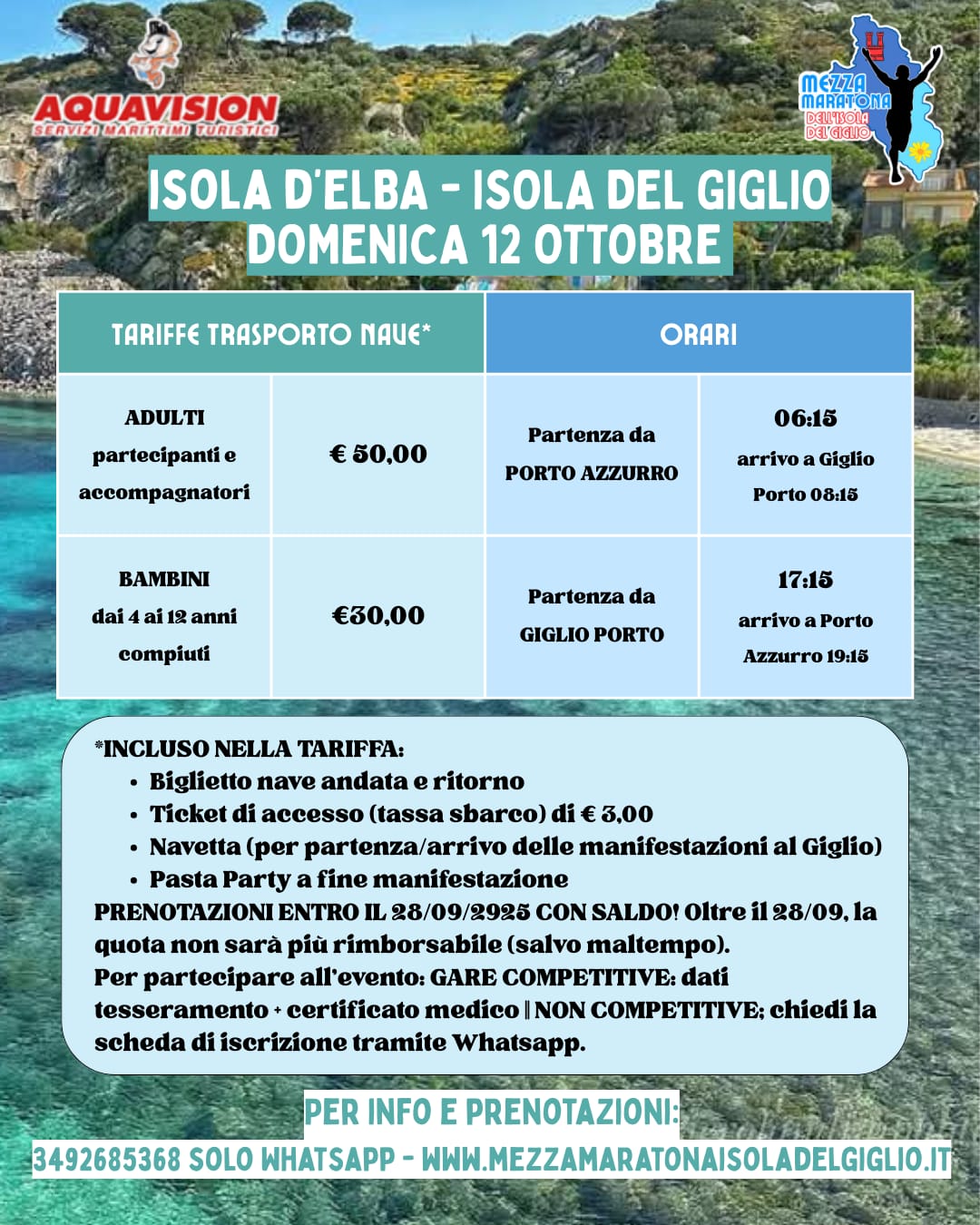 In occasione della Maratona del Giglio, Aquavison effettuerà un servizio straordinario con un servizio dall’Isola d’Elba a Giglio Porto. Per una giornata di svago- dicono gli organizzatori – di sport e divertimento. L’occasione è quella della maratona per adulti e bambini o per il trekking oppure per la passeggiata. (Le condizioni nella locandina allegata). Il termine ultimo per iscriversi o prenotare il solo biglietto nave, sarà venerdi 10 ottobre. Per info e dettagli negli allegati oppure tramite whatsapp al numero 3492685368