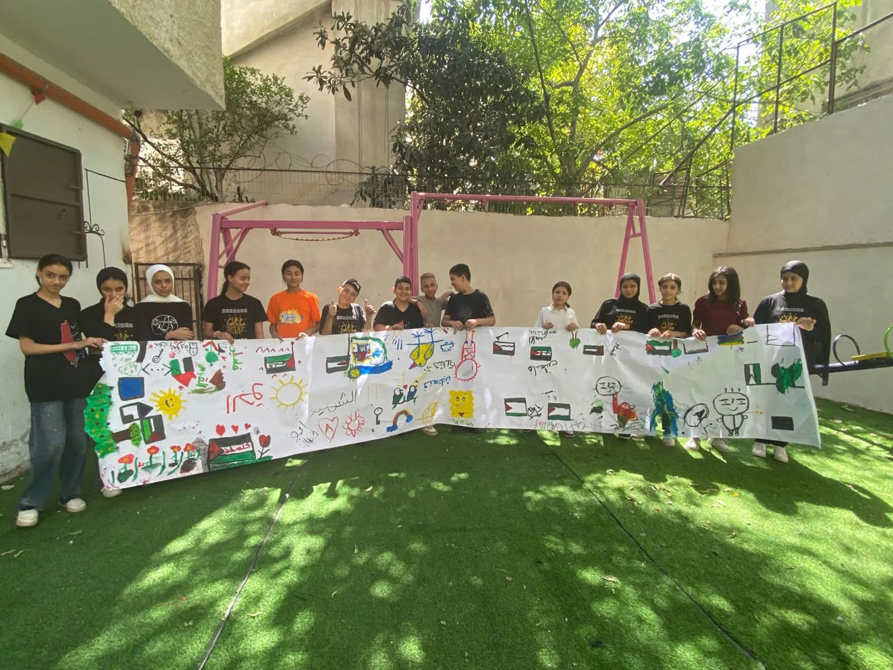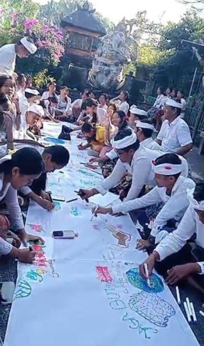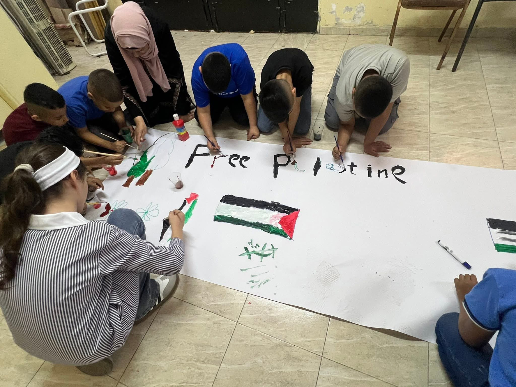 Bambini di Bali e di Nablus mentre decorano il drappo