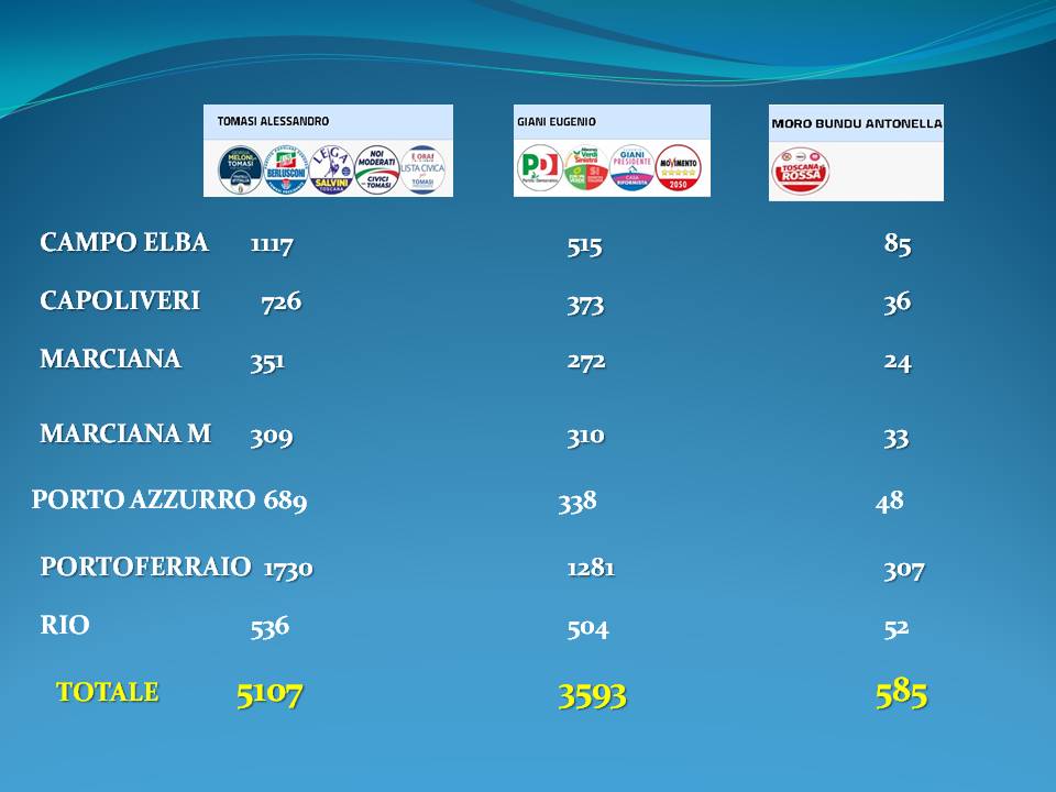 Nel totale dei voti di lista, quindi, il candidato del centrodestra Alessandro Tomasi ha avuto  5107    voti, contro   3593       di Eugenio Giani, i  585      della Bundu di Toscana Rossa.