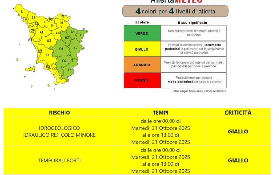 La Sala operativa unificata della Protezione civile regionale ha emesso un bollettino di criticità gialla per rischio idrogeologico e idraulico del reticolo minore e temporali forti che interesserà, dalle ore 18 di oggi, lunedì 20, fino alle 9 di domani, martedì 21, la Versilia, la Garfagnana e la Lunigiana, dove il codice, a partire dalla mezzanotte, è anche per rischio idraulico del reticolo principale.