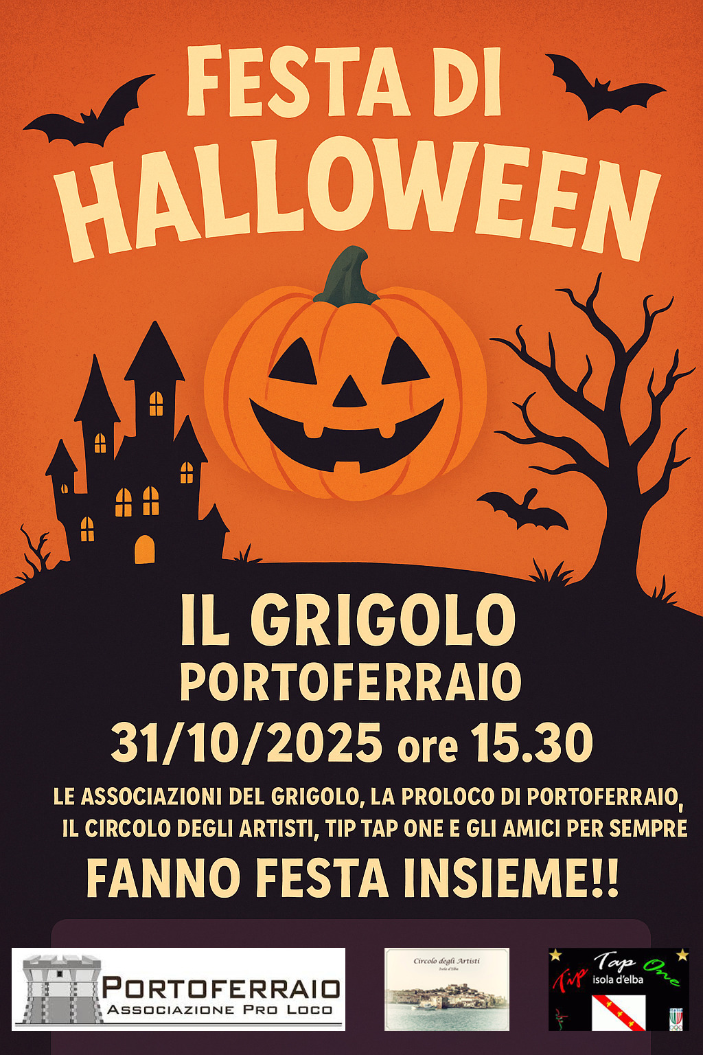 Venerdì 31 ottobre, dalle ore 15.30, al Grigolo di Portoferraio, le Associazioni del Grigolo, la Pro Loco di Portoferraio, il Circolo degli Artisti, Tip Tap One e Gli Amici per Sempre fanno festa tutti insieme all’insegna del dolcetto o scherzetto, musica e tanto divertimento per grandi e piccini. Dress code: travestimento mostruoso obbligatorio!