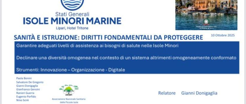 Sanità e istruzione diritti fondamentali da proteggere è uno temi temi che sarà affrontato agli stati generali delle Isole Minori a Lipari in questo fine settimana. Relatore sulla questione sarà il dottor Gianni Donigaglia presidente associazione sanitaria nazionale delle Piccole Isole. Si parerà di come garantire adeguati livelli di assistenza.