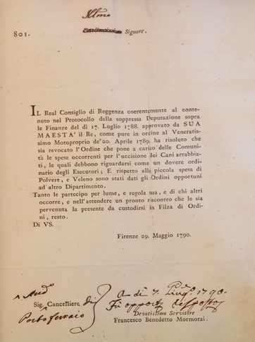 Il Real Consiglio di Reggenza del granduca che amministra il granducato di Toscana con sede in Firenze,ha revocato l’ordine che pone a carico della comunità le spese occorrenti per l’uccisione dei cani arrabbiati,spese che debbono essere a carico di chi esegue la uccisione. Aggiunge il “devotissimo servitore” che per la spesa del veleno sono stati dati ordini opportuni ad altro dipartimento.