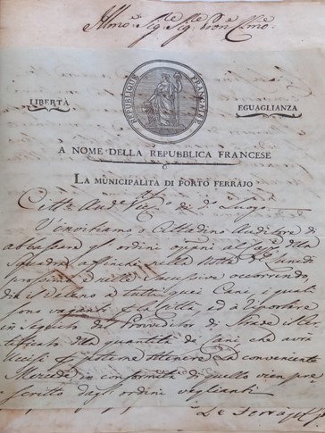 Ma la presenza di cani arrabbiati e circolanti continua nella città di Portoferraio anche negli anni successivi, durante il periodo francese ,nel quale Portoferraio e l’Elba ,dopo il trattato di Amiens (1802),sono annesse alla Francia.Lo documenta carta di archivio della suddetta epoca documenta conservata nell’archivio storico di Portoferraio.
