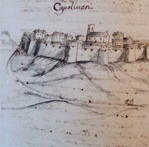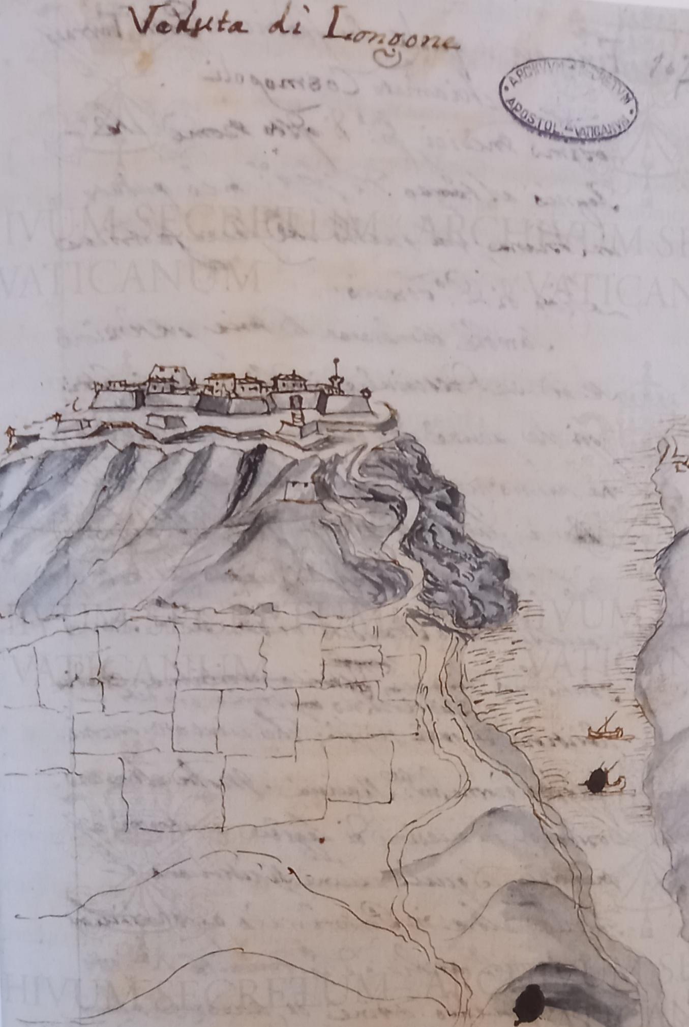 Veduta della Real Piazza di Longone . Disegno matita nera. Antonio Sarri (1662-1732) ingegnere di Portoferraio e primo capitano del presidio di Porta di Mare . ”Isola dell’Elba suo territorio con tutto quello che in essa si ritrova, di abitattioni,fortezze,castelli,terre,miniere,pietre,marmi,boschi e animali attentamente osservate dal Capitano Antonio Sarri dedicate al merito sublime dell’’Illustrissimo Signore Signore Padrone Collendissimo” Manoscritto Antonio Sarri , Archivio segreto vaticano cinte murarie a difesa di abitazioni ma con poca gente che vi abita.