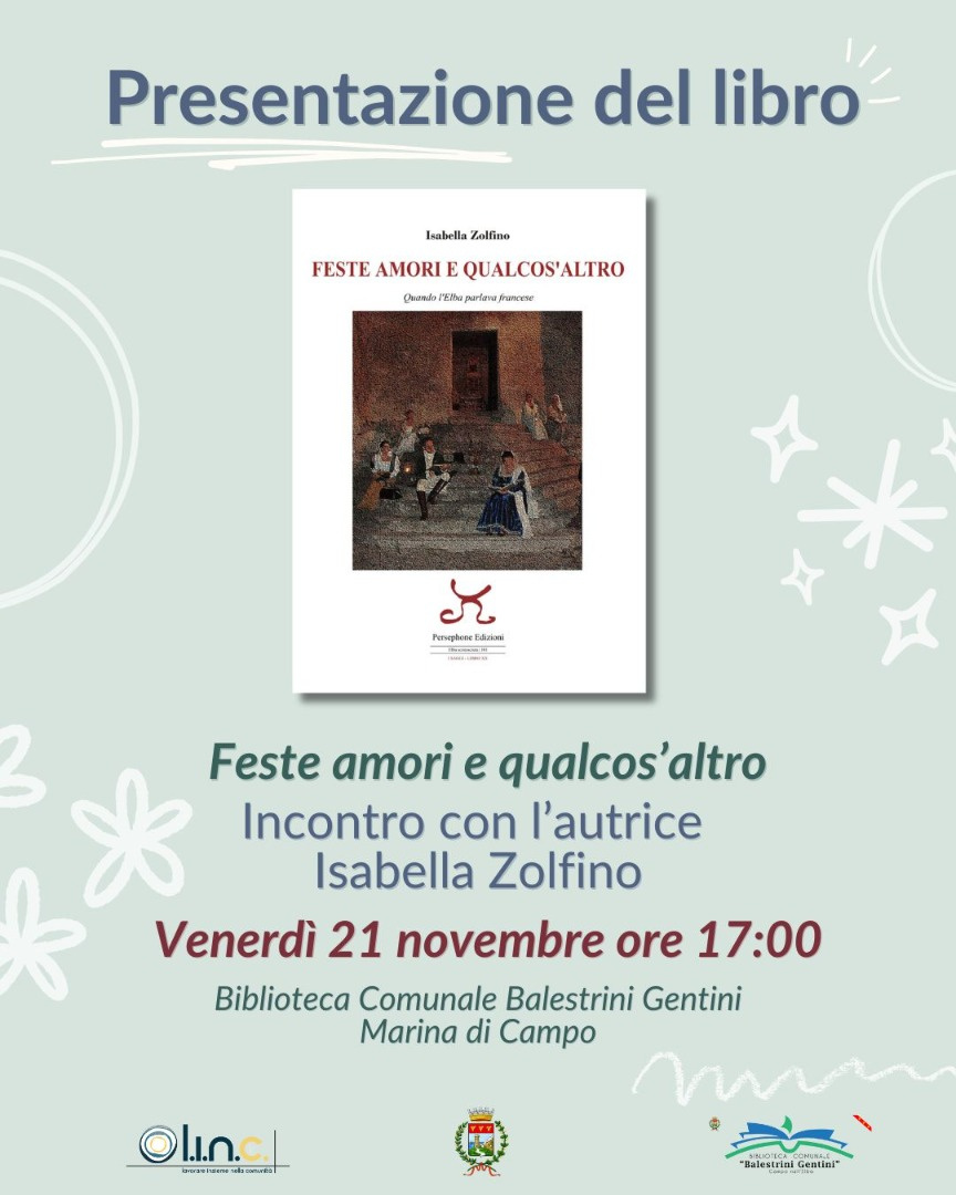 La Biblioteca di Marina di Campo annuncia con piacere la presentazione del libro di Isabella Zolfino, Feste amori e qualcos’altro, quando l’Elba parlava francese, edito dalla casa editrice locale Persephone Edizioni. L’incontro si terrà venerdì 21 novembre alle ore 17:00 presso gli spazi della biblioteca. Nel suo ultimo lavoro, l’autrice intreccia memorie, tradizioni, affetti e storia locale. Feste amori e qualcos’altro, quando l’Elba parlava francese invita il lettore a riscoprire l’isola nel periodo dell’occupazione francese, un periodo di grandi cambiamenti per la popolazione, attraverso scorci di vita quotidiana. Un mosaico narrativo in cui la dimensione privata si fonde con quella collettiva.