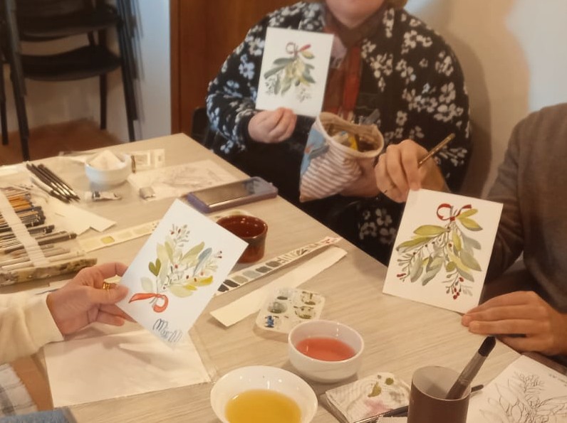 Si è svolto ieri presso l’Aula VerdeBlu “Giovanna Neri” a Mola il primo incontro di laboratorio di acquarello per la produzione di cartoline di Natale personalizzate, dedicato al Ramo di Vischio e condotto dalla pittrice e illustratrice Cristiana Zola. Un’occasione per approfondire una tecnica, pensare a regali non commerciali e non banali, vedere “da vicino” elementi naturali (l’anno scorso sempre presso l’Aula si è tenuto un corso di acquarello naturalistico) e passare del tempo insieme. Sono stati 12 i partecipanti, tra cui 4 bambini, a questo primo incontro, a cui ne seguirà un altro domenica 7 dicembre; gli incontri sono a offerta libera, è necessario iscriversi presso Cristiana – 3299640140 oppure Martina – 3404045618 che forniranno orari date e istruzioni per i materiali. Il piccolo ma efficiente centro di cultura sostenibile Aula VerdeBlu vi aspetta per questa ed altre iniziative, pronto ad abbracciarvi con la sua pace e le sue proposte.
