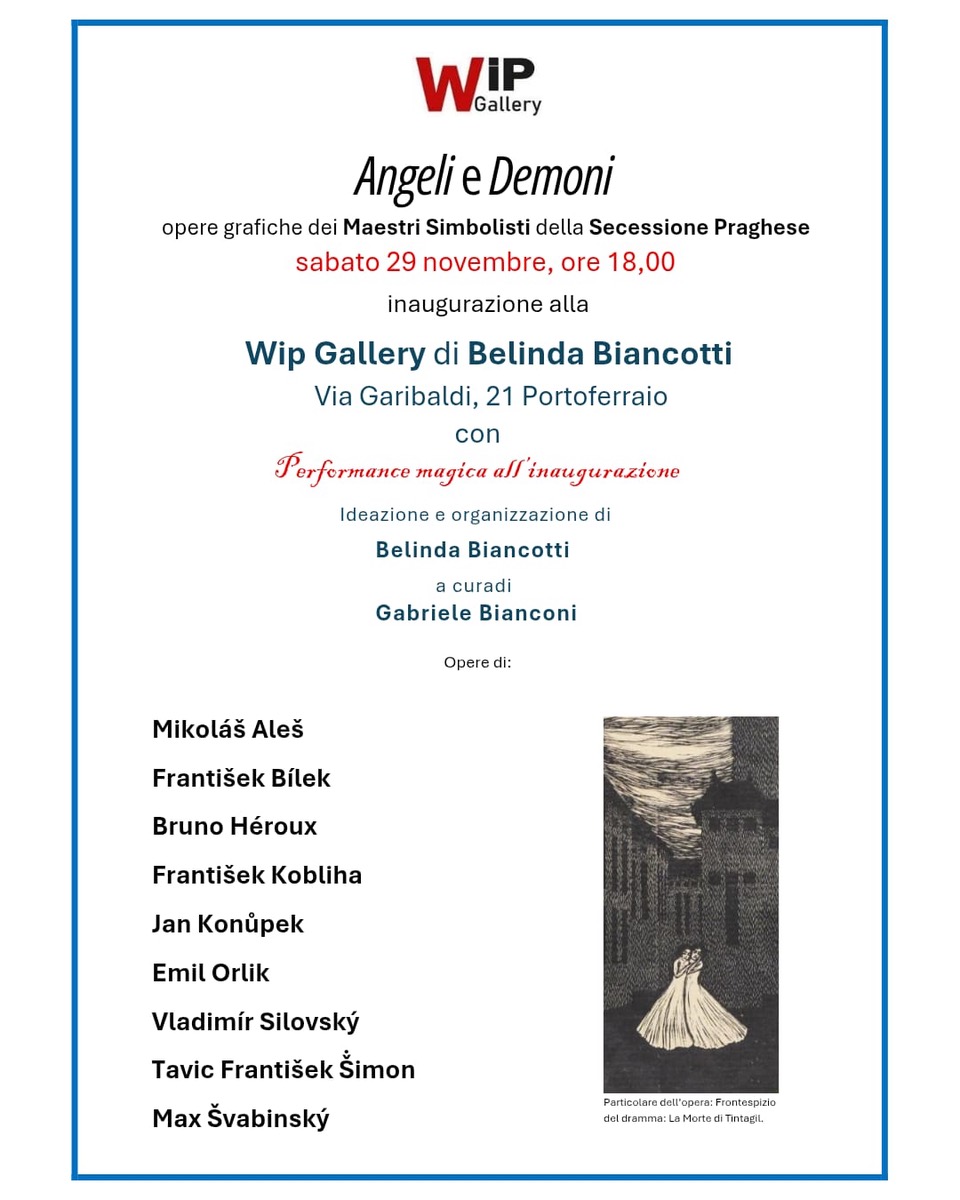 La Wip Gallery è lieta di annunciare l’apertura della mostra “Angeli e Demoni – Simbolisti a Praga”, un appuntamento culturale dedicato alla magnetica grafica dei principali protagonisti della Secessione Praghese. L’esposizione, curata dal critico d’arte Gabriele Bianconi, offre un percorso immersivo nella poetica visionaria e spirituale che ha caratterizzato l’arte mitteleuropea tra fine Ottocento e i primi decenni del Novecento. In mostra saranno presentate venti opere dei Maestri: Mikoláš Aleš, Jan Konůpek, Emil Orlik, Tavic František Ṧimon, František Bílek, František Kobliha, Bruno Héroux, Max Švabinský e Vladimír Silovský. Scrive Gabriele Bianconi: una selezione di rare grafiche create su tavole di legno o su lastre di metallo incise, inchiostrate e pressate sulla carta, rivelano un mondo simbolico popolato di figure angeliche e demoniache. Atmosfere sospese, visioni mistiche e tensioni interiori: un viaggio nell’immaginario esoterico e profondamente evocativo del Simbolismo Praghese. Testimonianze di una stagione artistica che ha saputo fondere misticismo, inquietudine e raffinatezza formale. Per cercare dei riferimenti storici precedenti, pertinenti non soltanto alla tecnica incisoria utilizzata, bisogna guardare alle stampe di Goya, come alle xilografie giapponesi. Le opere esposte, viste singolarmente e nell’insieme, manifestano con autorità, la rivoluzione estetica simbolista. Creazioni realizzate sulla carta, espressioni del mondo interiore: sognato ed emozionato, pauroso e tentato, libero e dannato, che si vuole integrato alla natura dell’universo. Un fantastico mistico e profano senza uguali, che diventerà la premessa di libertà per i successivi movimenti surrealisti ed espressionisti. Nell’architettura come nella produzione artigianale e industriale già dagli ultimi anni dell’Ottocento si afferma l’Art Nouveau, che coniuga la logica della struttura con l’armonia, la praticità essenziale della costruzione, all’estetica dell’arabesco, dell’ornamento; i materiali come il ferro battuto, l’acciaio, il vetro o la ceramica al disegno floreale, che si esprime con linee fluide e sinuose ispirate alla natura. Praga diventa in quegli anni un raccordo teso tra Vienna e Parigi in cui il fermento culturale germoglia nelle esperienze degli artisti locali che si riconosceranno nel movimento artistico chiamato Secessione Praghese, dando dei frutti inediti ed originalissimi che raggiungono proprio con le tecniche incisorie un apice senza precedenti. È un mondo nuovo che si oppone alla cultura dominante borghese e alla pittura realista ed impressionista. La cultura del simbolismo si diffonde dando vita ad opere d’arte che la ‘rispecchiano’ nella scultura, nella pittura, nella grafica, nella architettura, come nella poesia, nel teatro, nella musica. Il Castello, pregevole acquaforte di Aleš del 1930, è un paesaggio lirico e fiabesco che affianca la meravigliosa Sabba: opera presentata autonomamente in galleria in occasione di Halloween; creazione struggente che si distingue per la potenza evocativa e visiva, un viaggio nell’immaginario del sabba tra leggende ancestrali, simboli esoterici, eros e richiami alla cultura e ad antiche tradizioni popolari. Anche i Due Alberi di Konůpek sono fiabeschi, nel senso che il paesaggio rappresentato si discosta dal reale oggettivo, ma qui la sintesi è maggiore e la natura si anima dal suo interno di energia tesa e