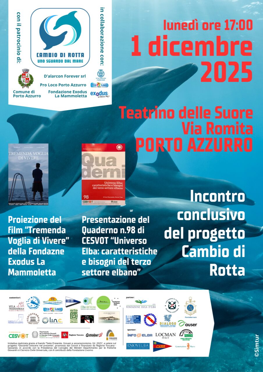 Confermato invece a Porto Azzurro, l’evento finale del progetto “Cambio di Rotta”, il 1 dicembre alle ore 17.00 presso il Teatrino delle Suore, in collaborazione con il Comune e la Pro Loco, . Sarà proiettato il docu-film “Tremenda Voglia di Vivere” della Fondazione Exodus. Il documento, che ha vinto numerosi premi internazionali, è stato realizzato all’interno della comunità di Don Mazzi ” La Mammoletta” a Portoferraio. I “non protagonisti !!!!” sono i ragazzi di Don Antonio che lanciano un messaggio forte ed evidente…. nella vita si può sbagliare ma si può anche decidere di “cambiare rotta”: fermarsi, rimotivarsi e riprendere per aprire nuove strade impossibili.