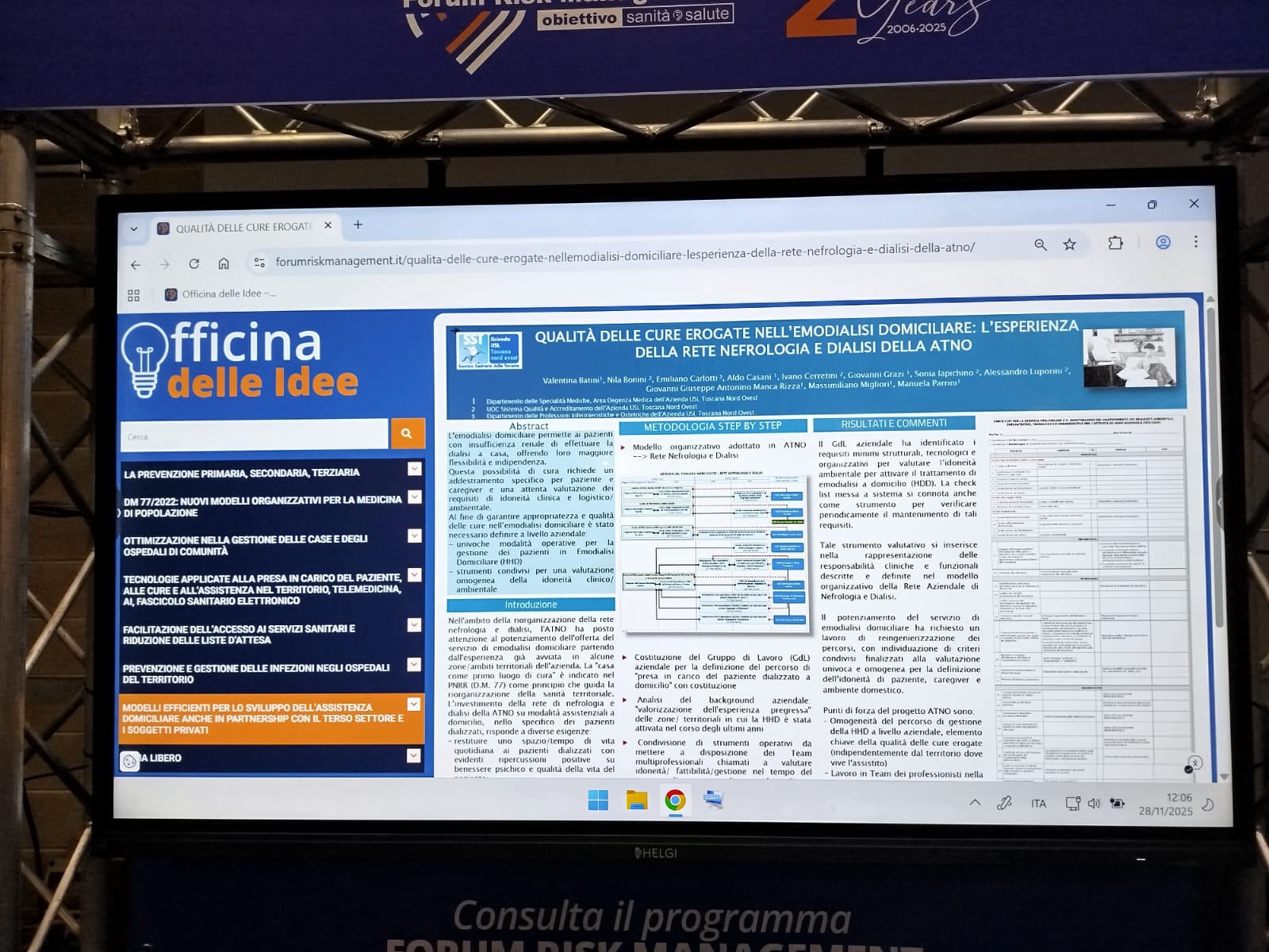 Omogeneità del percorso di gestione della dialisi a domicilio (HHD) su tutto il territorio della ASL Toscana nord ovest; lavoro in team dei professionisti nella presa in carico del nucleo familiare e coinvolgimento del paziente che partecipa in maniera attiva alla definizione del percorso di cura, sono gli obiettivi del progetto realizzato dai dipartimenti medico e infermieristico e ostetrico e dalla struttura della qualità e accreditamento, presentato al Forum Risk Management di Arezzo.